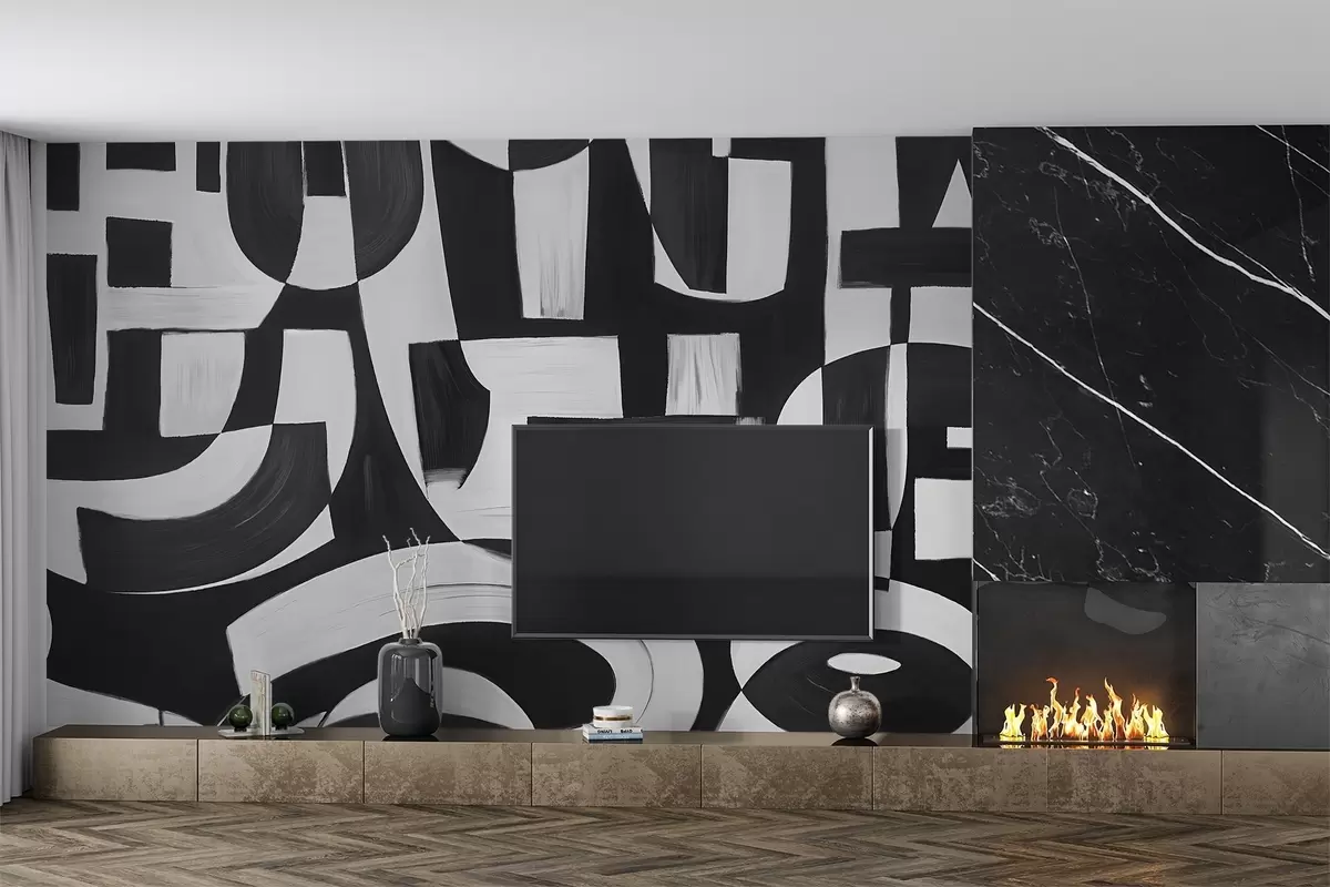 Fototapety Abstraktní černobílé geometrické tvary a vzory, které vytvářejí vizuálně působivou a dynamickou kompozici Č. w08608