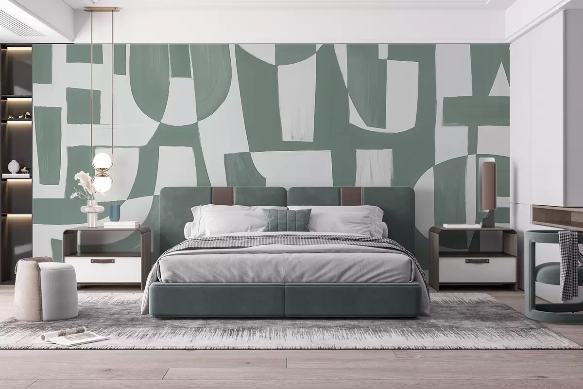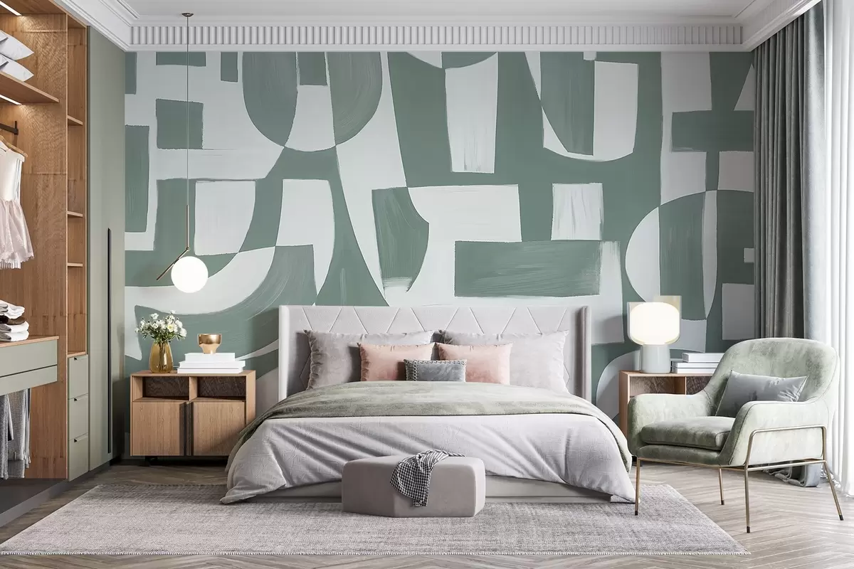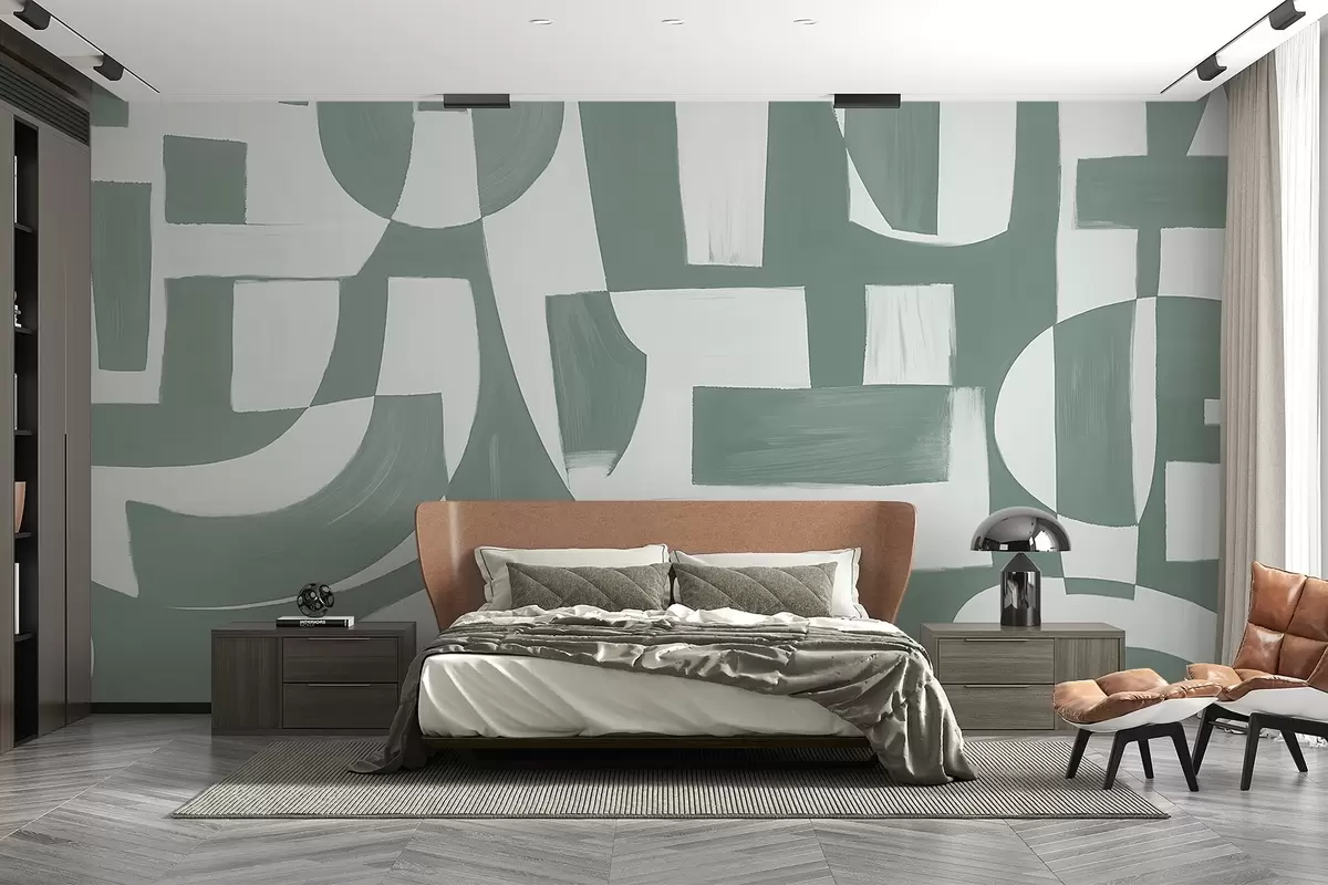 Fototapety Abstraktní zelené a bílé geometrické tvary a vzory, které vytvářejí vizuálně působivou a dynamickou kompozici Č. w08608v1