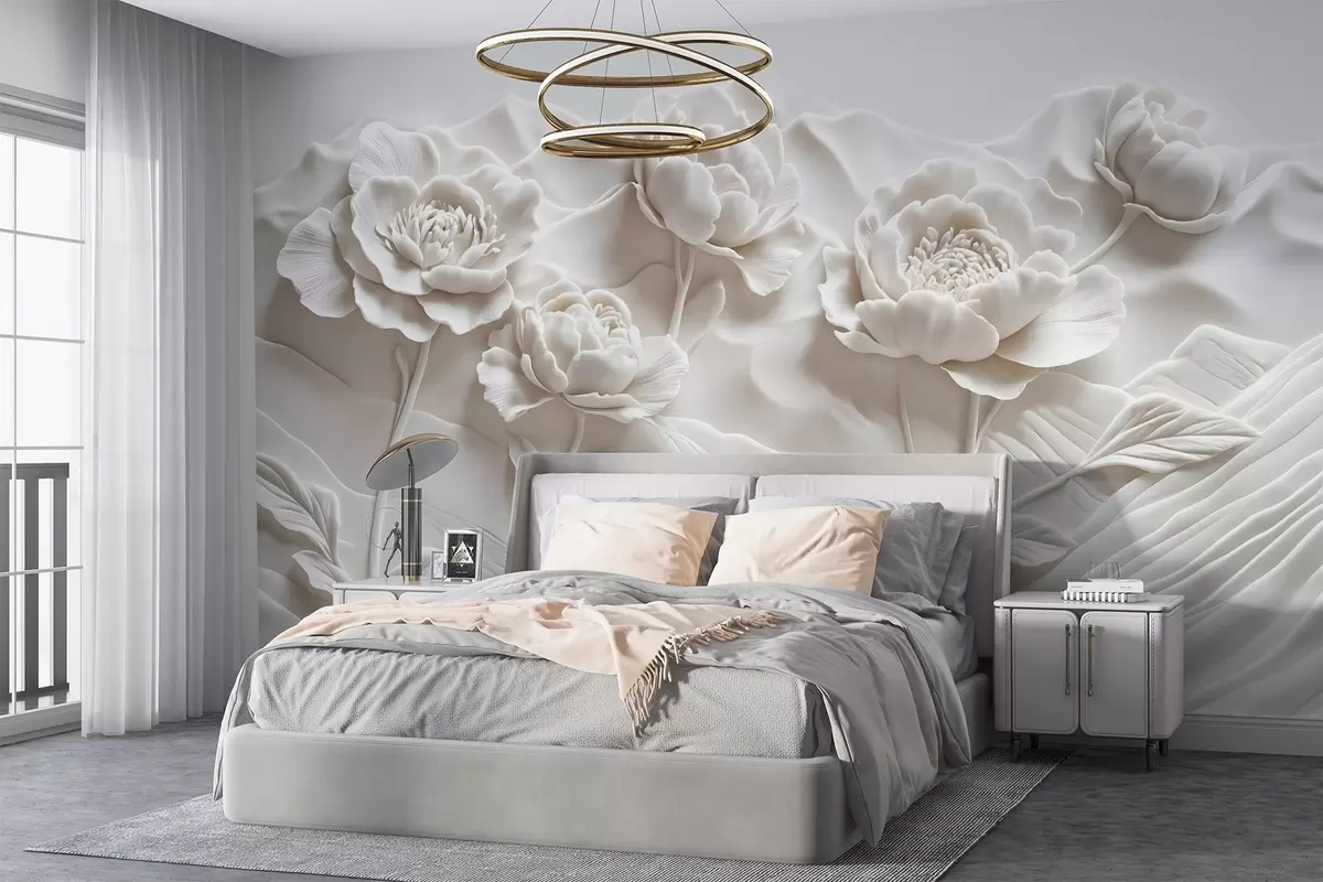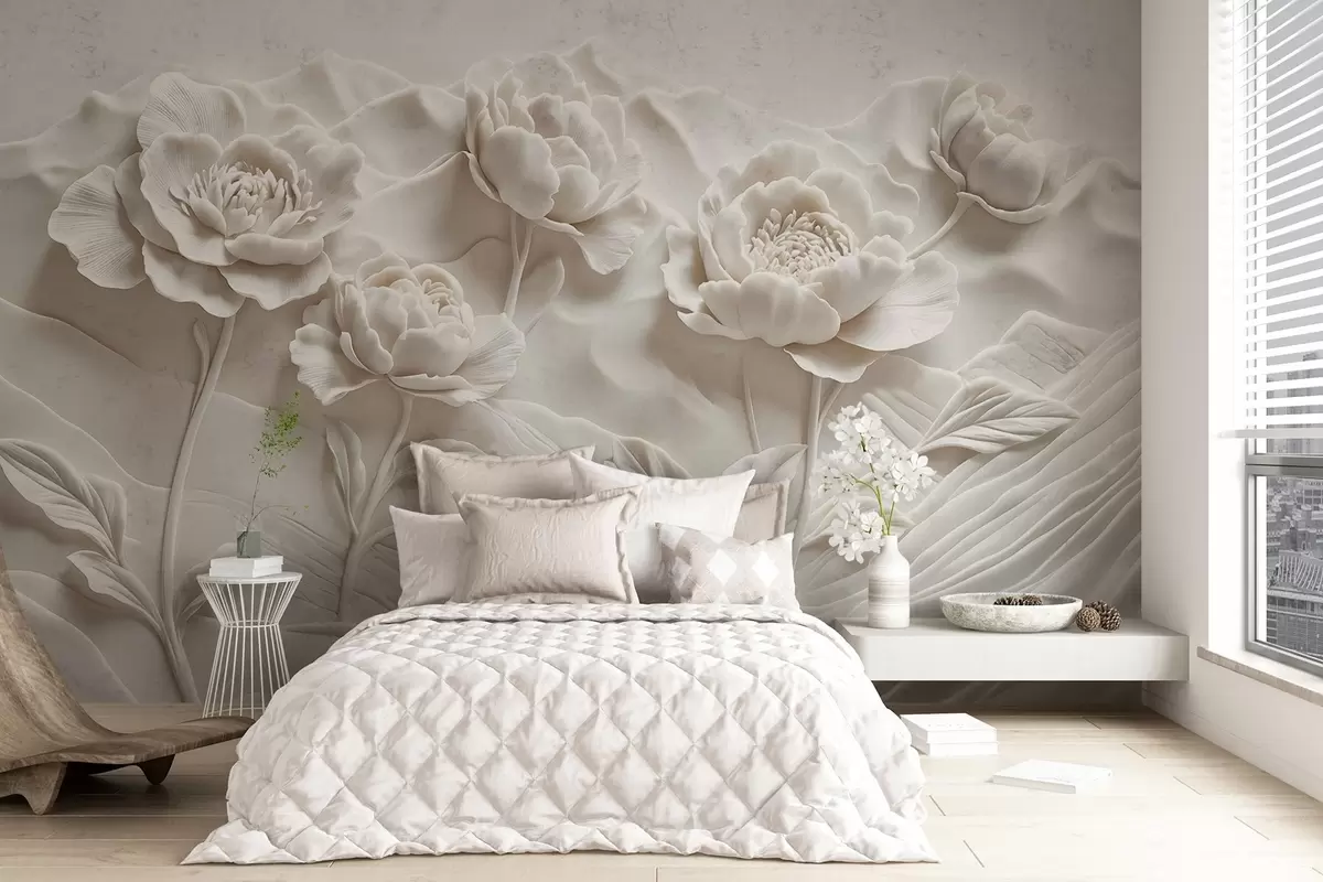 Fototapety Bílá květinová imitace reliéfní plastiky s velkými detailními květy pivoněk na hladkém pozadí Č. w08612