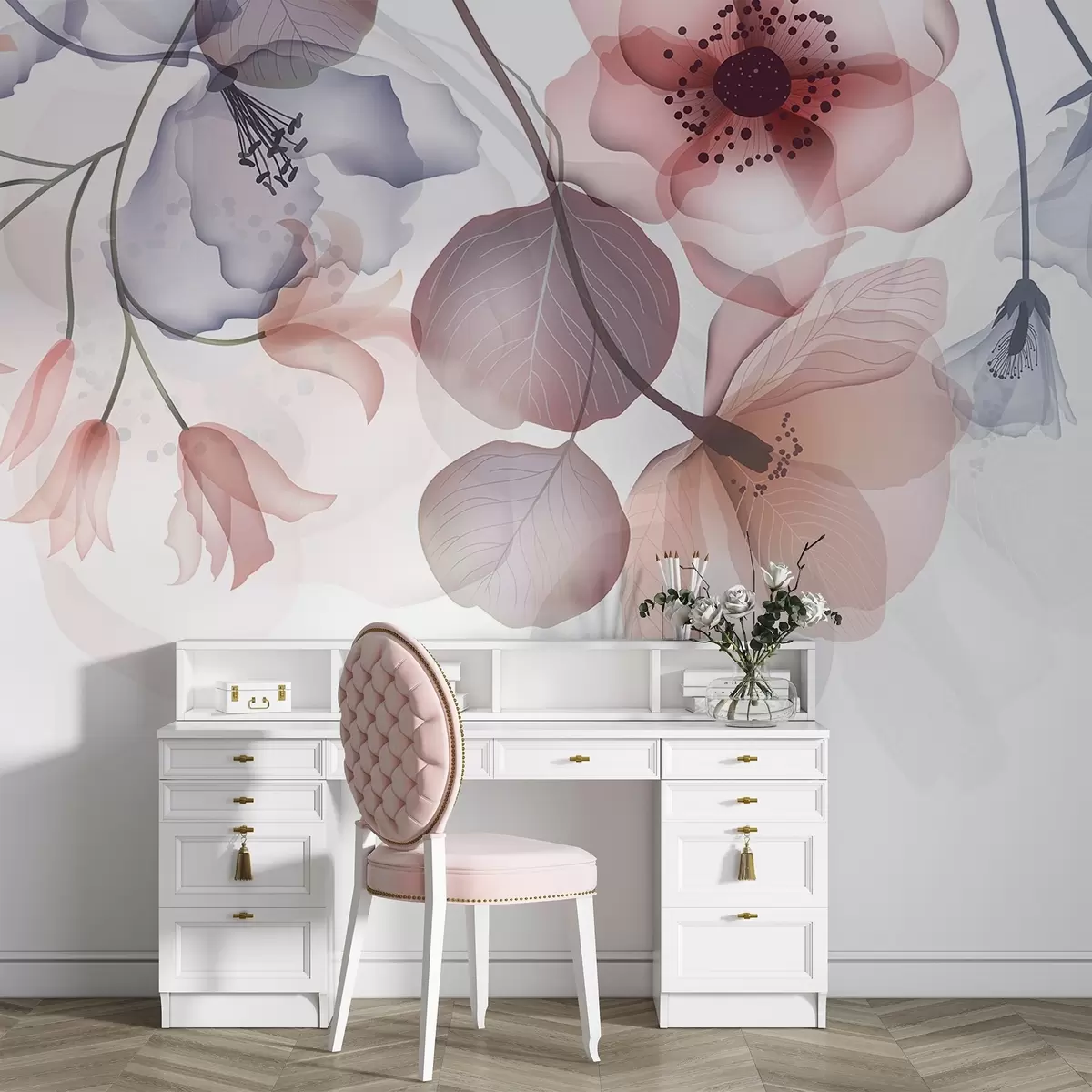 Fototapety Jemné růžové a šedé průsvitné květy s jemnými okvětními lístky a tmavými středy na světlém pozadí Č. w08613