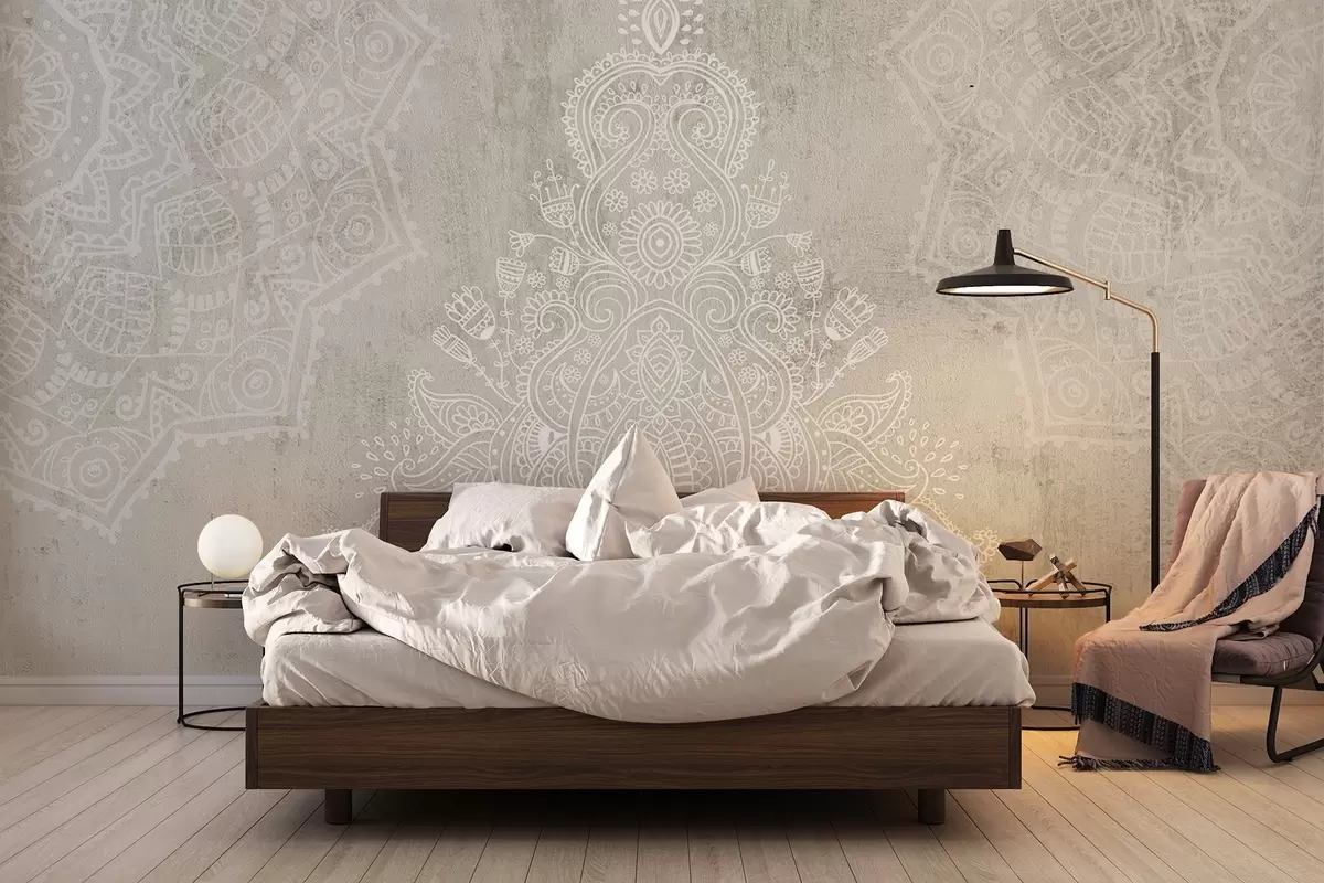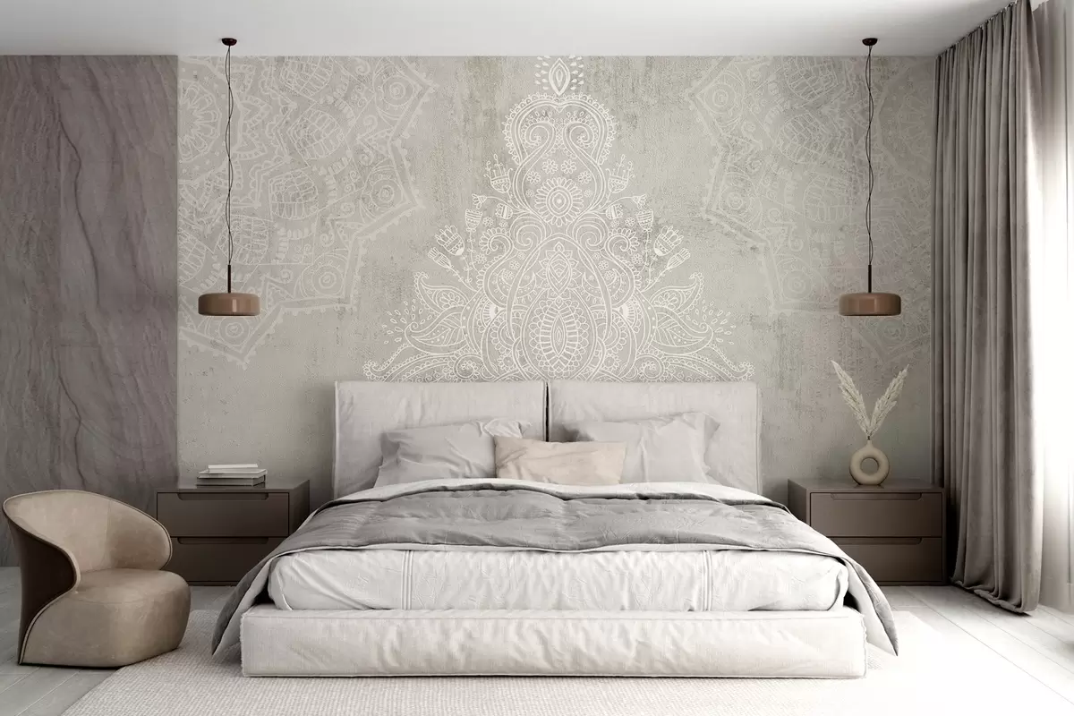 Fototapety Detailní, složitý potisk bílé krajky mandaly na světle béžovém abstraktním pozadí s texturou Č. w08614