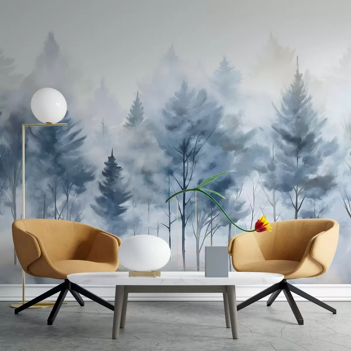 Fototapety Mlhavá lesní krajina s vysokými borovicemi a holými listnatými stromy v popředí akvarel imitující umění Č. w08643