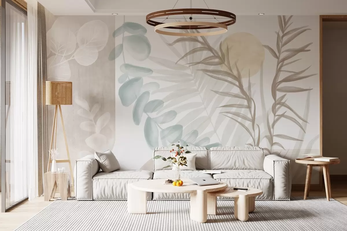 Fototapet Minimalistický abstraktní potisk se stylizovanými listy a eukalipty s jemnými béžovými organickými tvary v tlumených pastelových barvách w08648
