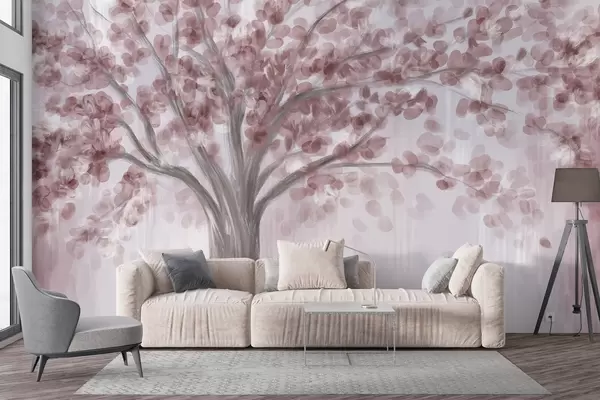 Fototapety Velký strom s jemnými abstraktními listy v růžové barvě na světlém, neutrálním pozadí, které zvýrazňuje tóny stromu Č. w08669v2