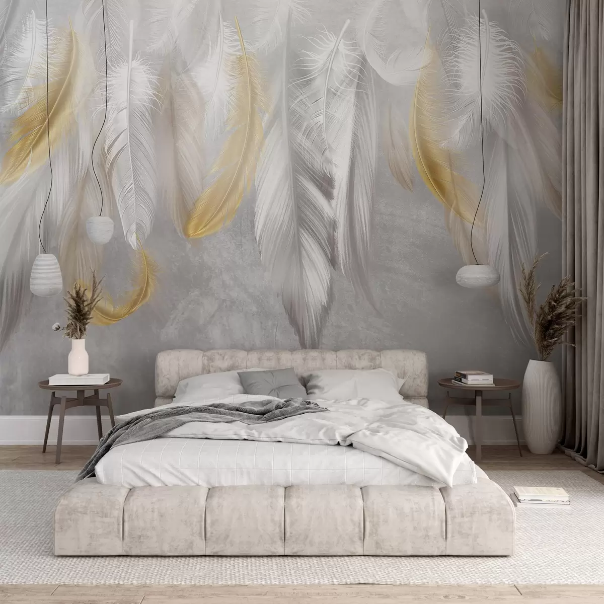 Fototapety Bílá a žlutá pírka visící na jemném šedém pozadí vytvářejí jemnou a vzdušnou kompozici Č. w08670