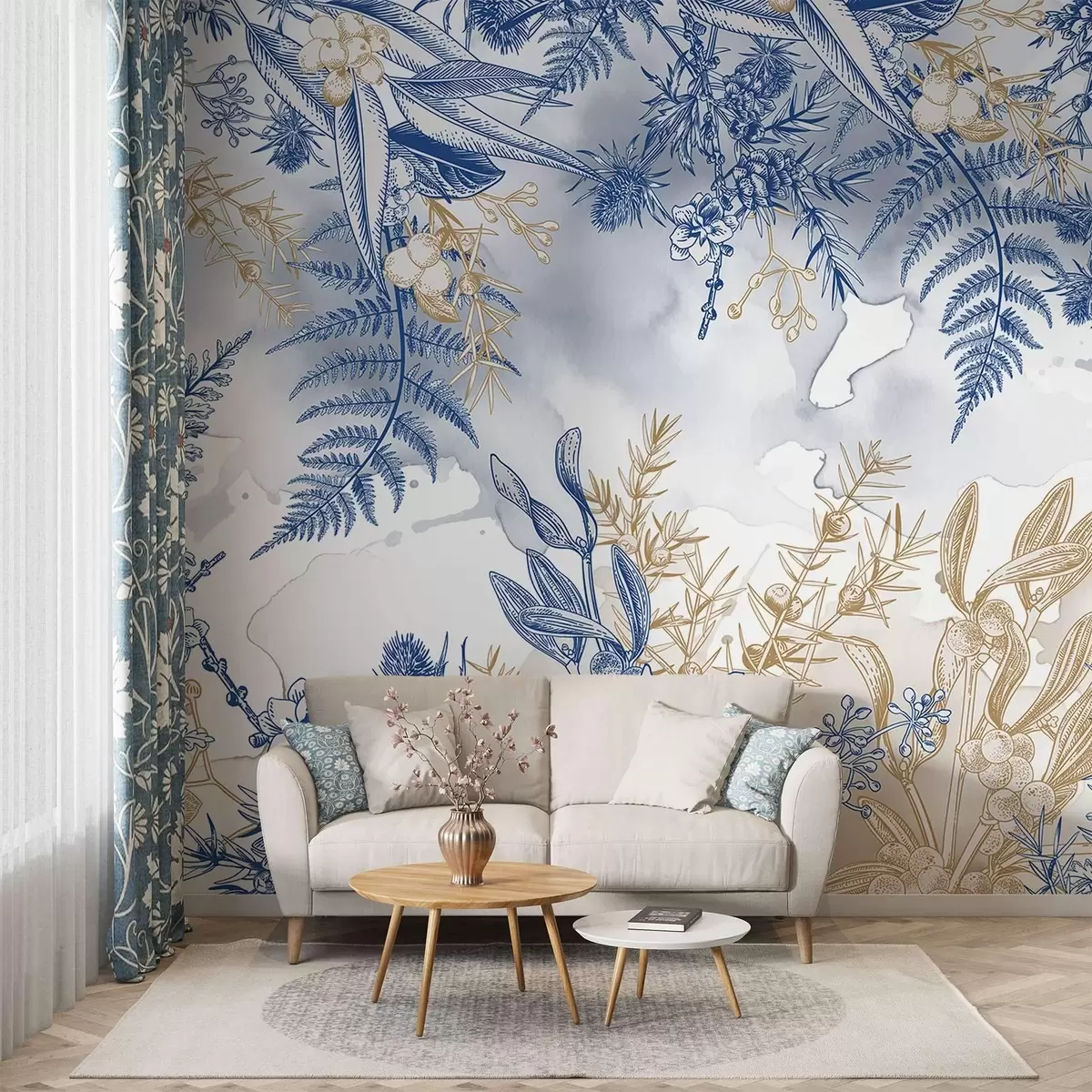 Fototapety Květinový potisk s modrými a žlutými botanickými prvky na světlém, jemném pozadí s akvarelovými efekty Č. w08671