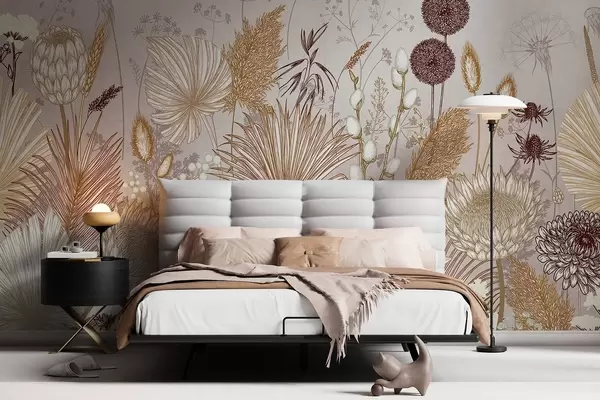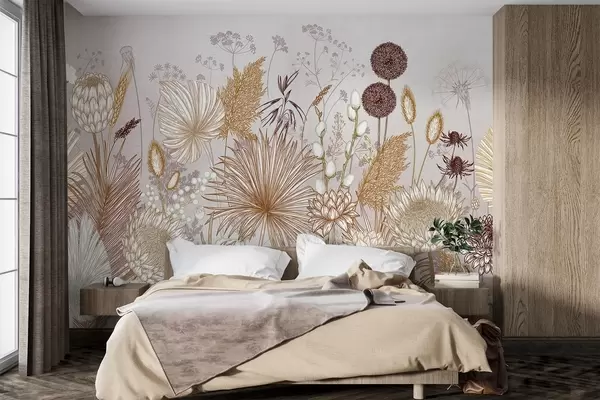 Fototapety Květiny a rostliny v teplých tónech béžové barvy v botanickém stylu s různými tvary a texturami Č. w08672