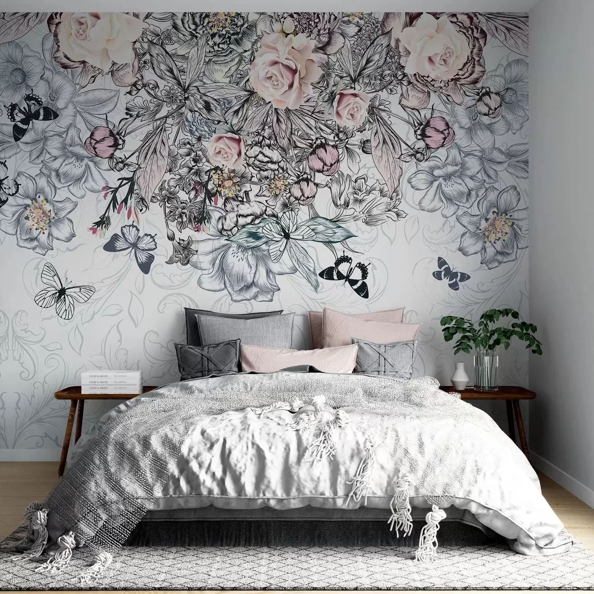 Fototapety Květinová kresba s růžovými růžemi a různými květinami a motýly se složitými čarami na texturovaném pozadí Č. w08674