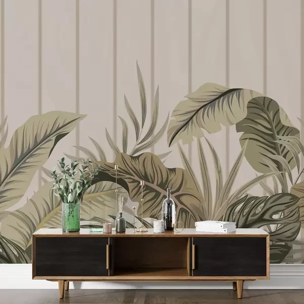 Fototapety Vzor tropického listí v tlumených zelených a béžových tónech na světlém pozadí se svislými liniemi Č. w08683