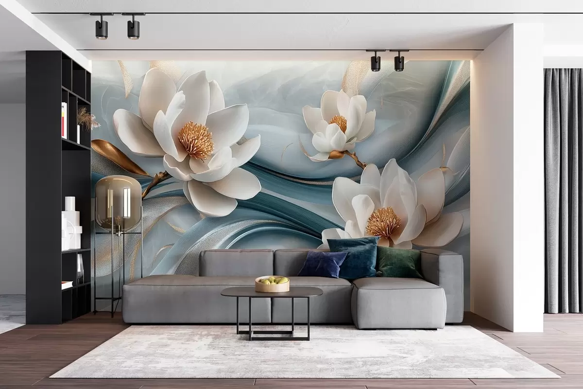 Fototapety Květy magnólie v kombinaci s modrými, bílými a žlutými tóny s abstraktními vlnami Č. w08695