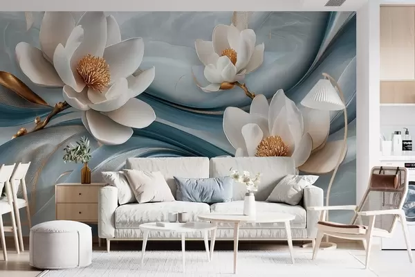 Fototapety Květy magnólie v kombinaci s modrými, bílými a žlutými tóny s abstraktními vlnami Č. w08695
