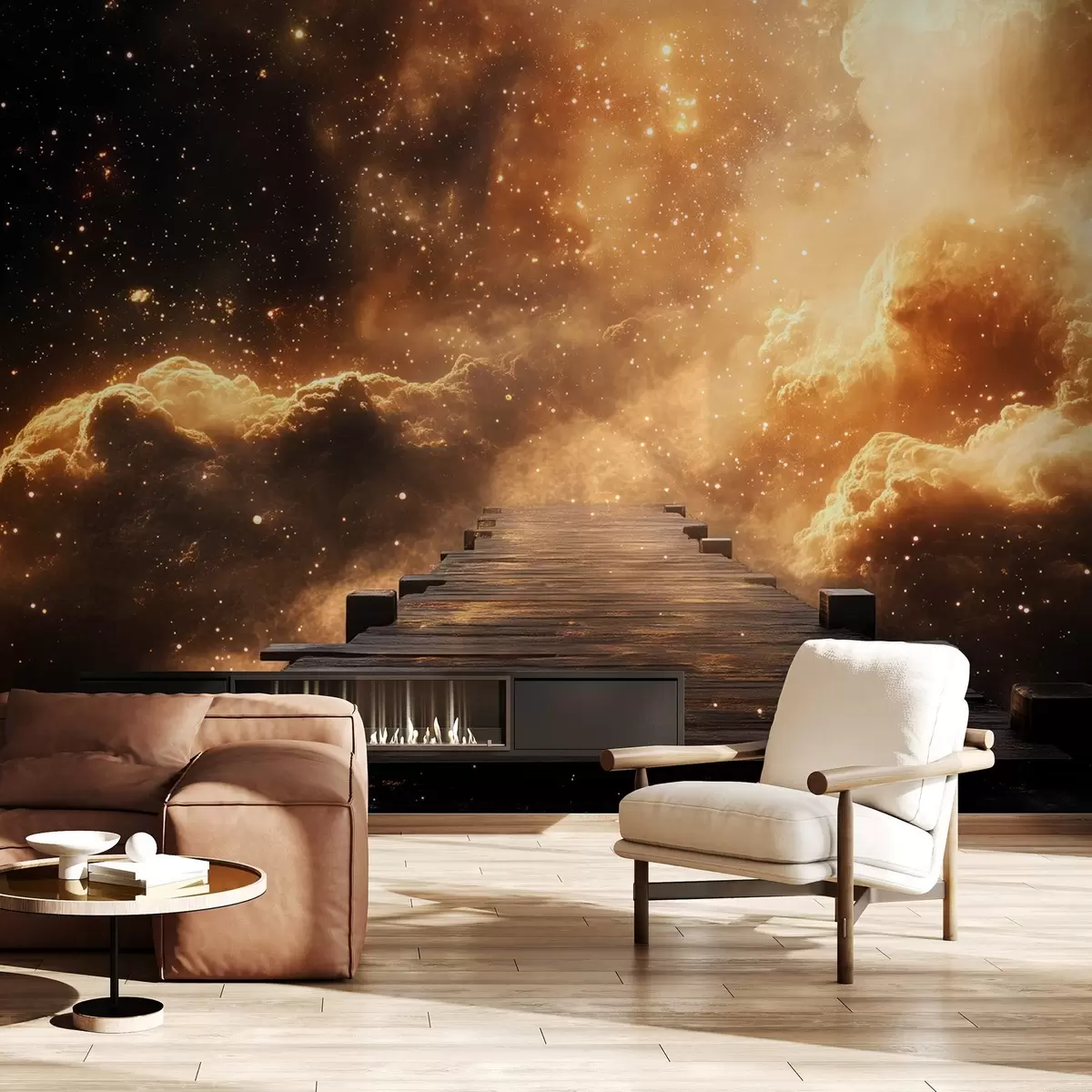 Fototapety Kosmická žlutočerná hvězdná obloha s dřevěným molem Č. w08723