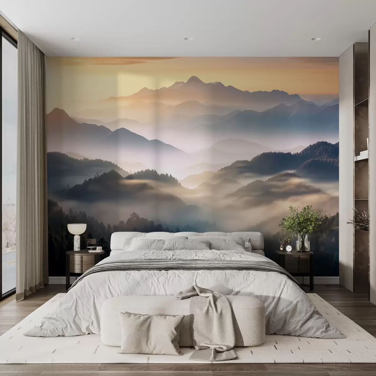 Fototapety Klidná horská krajina za úsvitu, kdy borovice zahaluje jemná mlha Č. w08748