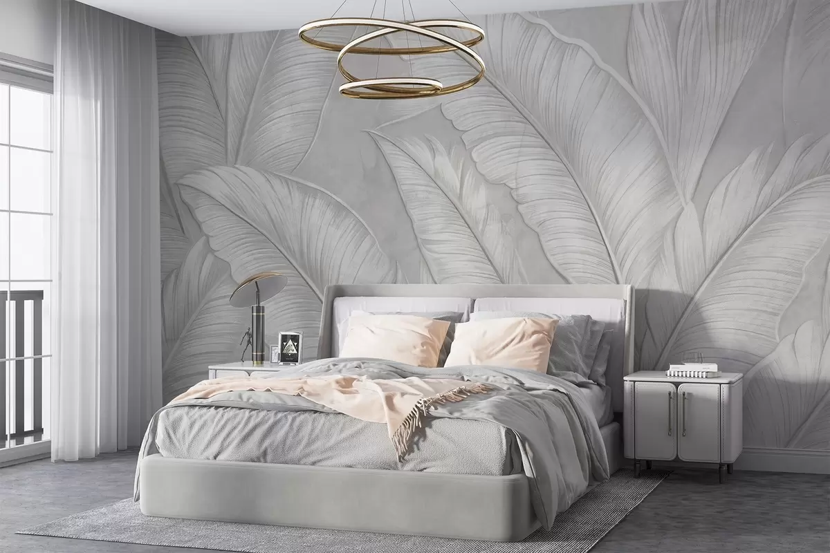 Fototapety Velké tropické listy s vysokou texturou v monochromatické světle šedé barvě v loftovém stylu Č. w08772