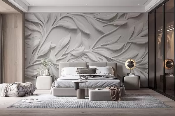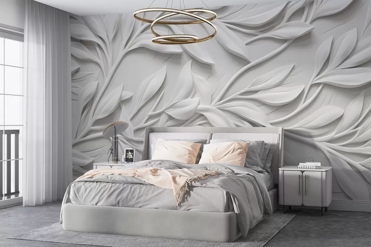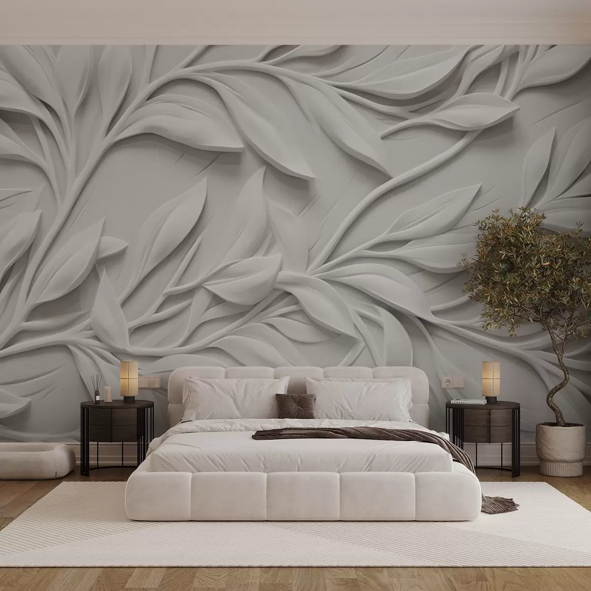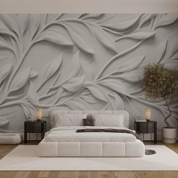 Fototapety Bílý texturovaný potisk s listy a větvemi , který vytváří objemný imitační efekt na texturovaném pozadí Č. w08778
