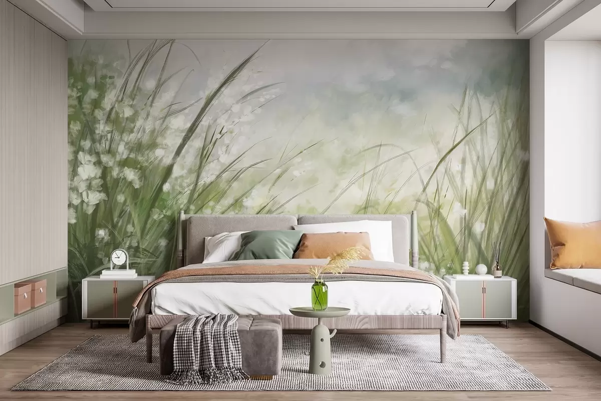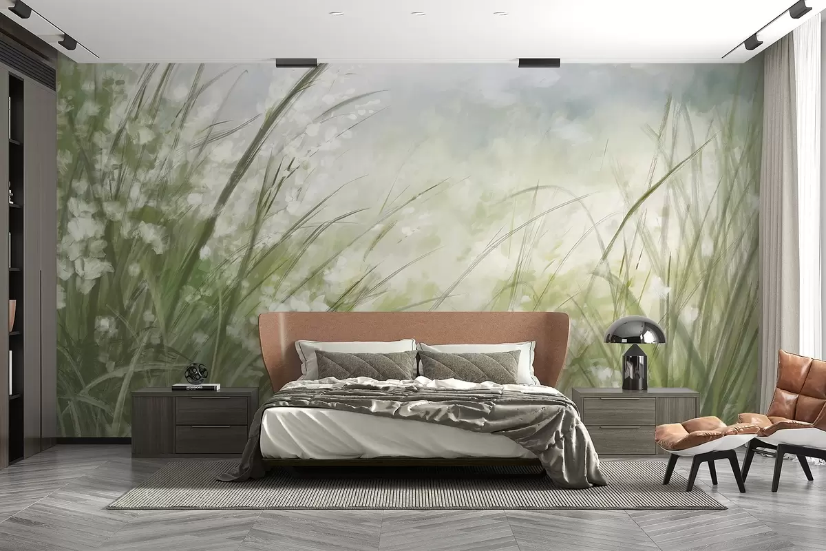 Fototapety Svěží zelená tráva s jemnými bílými květy, jemně rozmazaný potisk se světlými odstíny, který vytváří klidnou krajinu Č. w08779