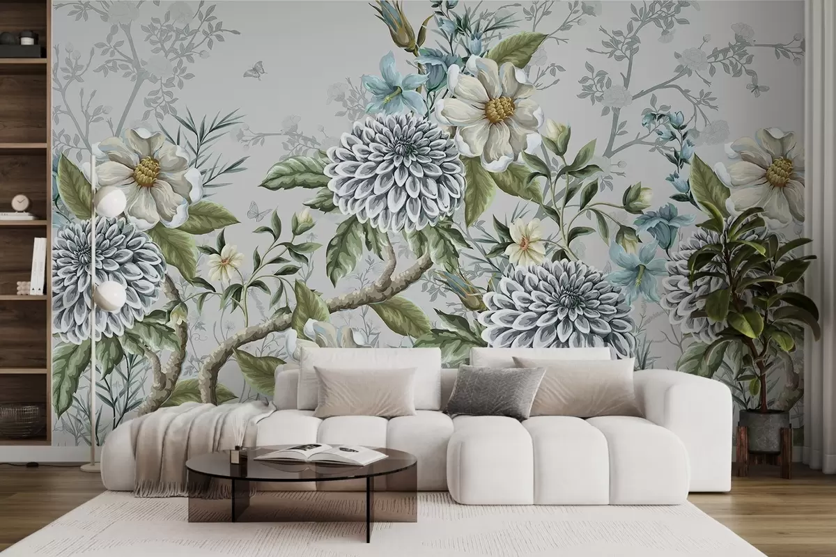 Fototapety Květinový potisk s chryzantémami, jemnými modrými květy a zelenými listy propletenými větvemi Č. w08782