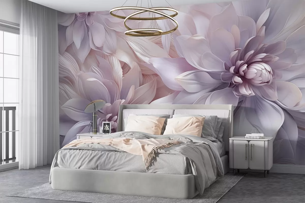 Fototapety Jemné, vrstvené květy v odstínech světle růžové, levandulové a bílé s jemnými okvětními lístky a složitými detaily Č. w08783