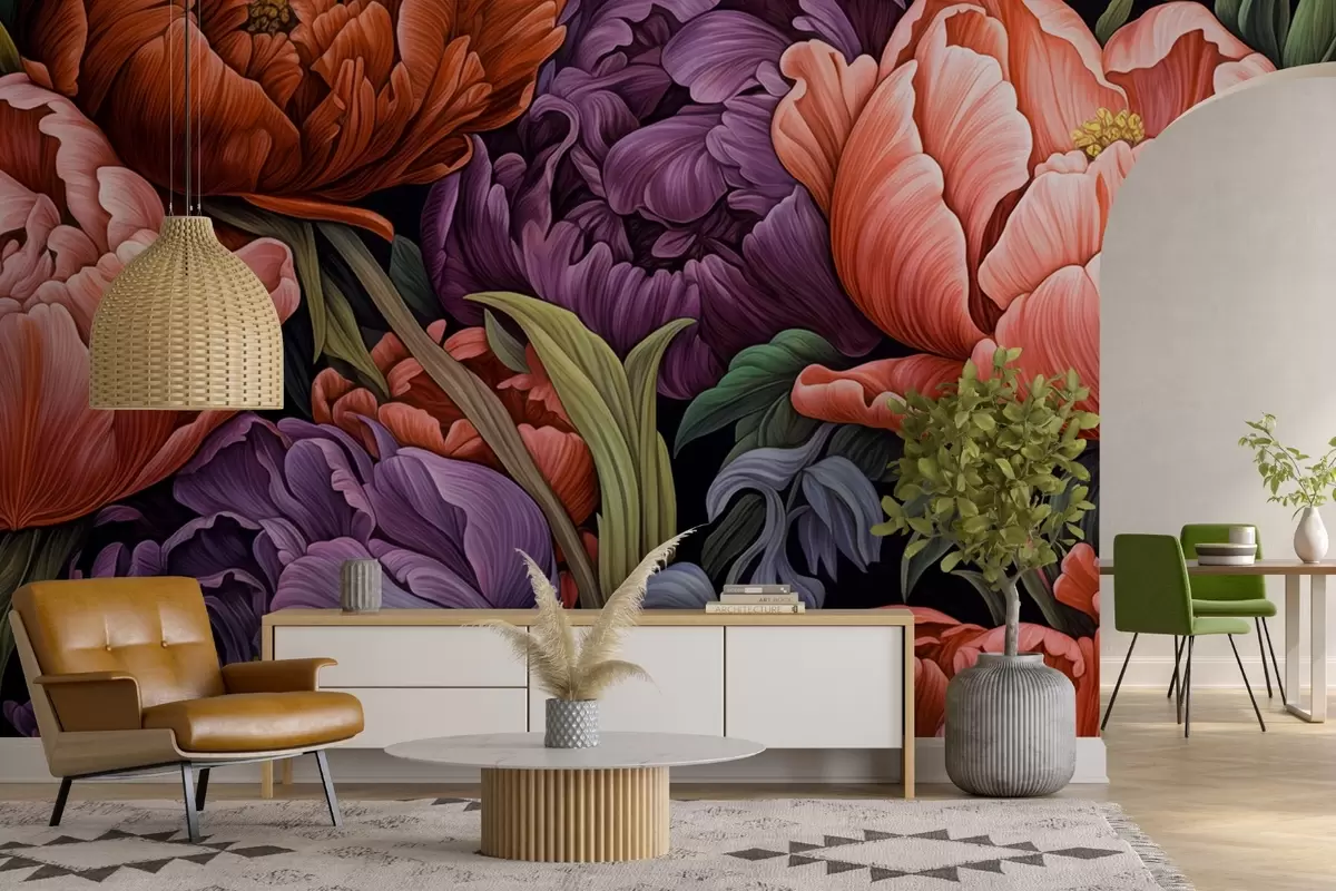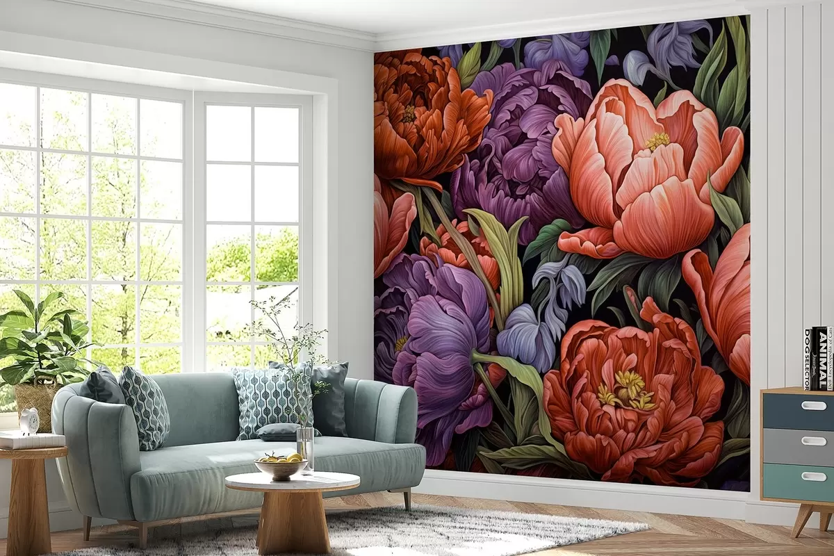 Fototapety Tulipány a pivoňky ve viktoriánském stylu v červené a fialové barvě Č. w08818v1