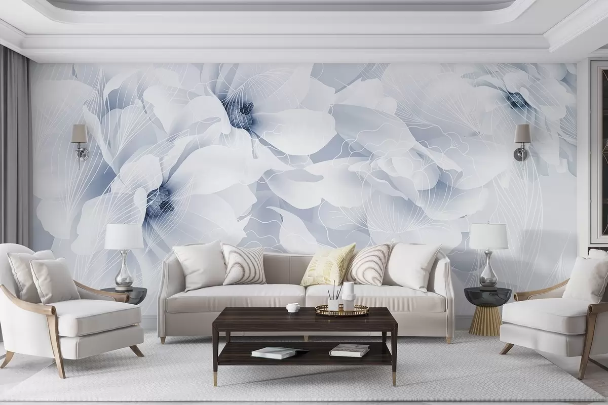 Fototapety Pastelové květy pivoněk s bílými a modrými jemnými okvětními lístky a bílými liniemi na světle modrém pozadí Č. w08826