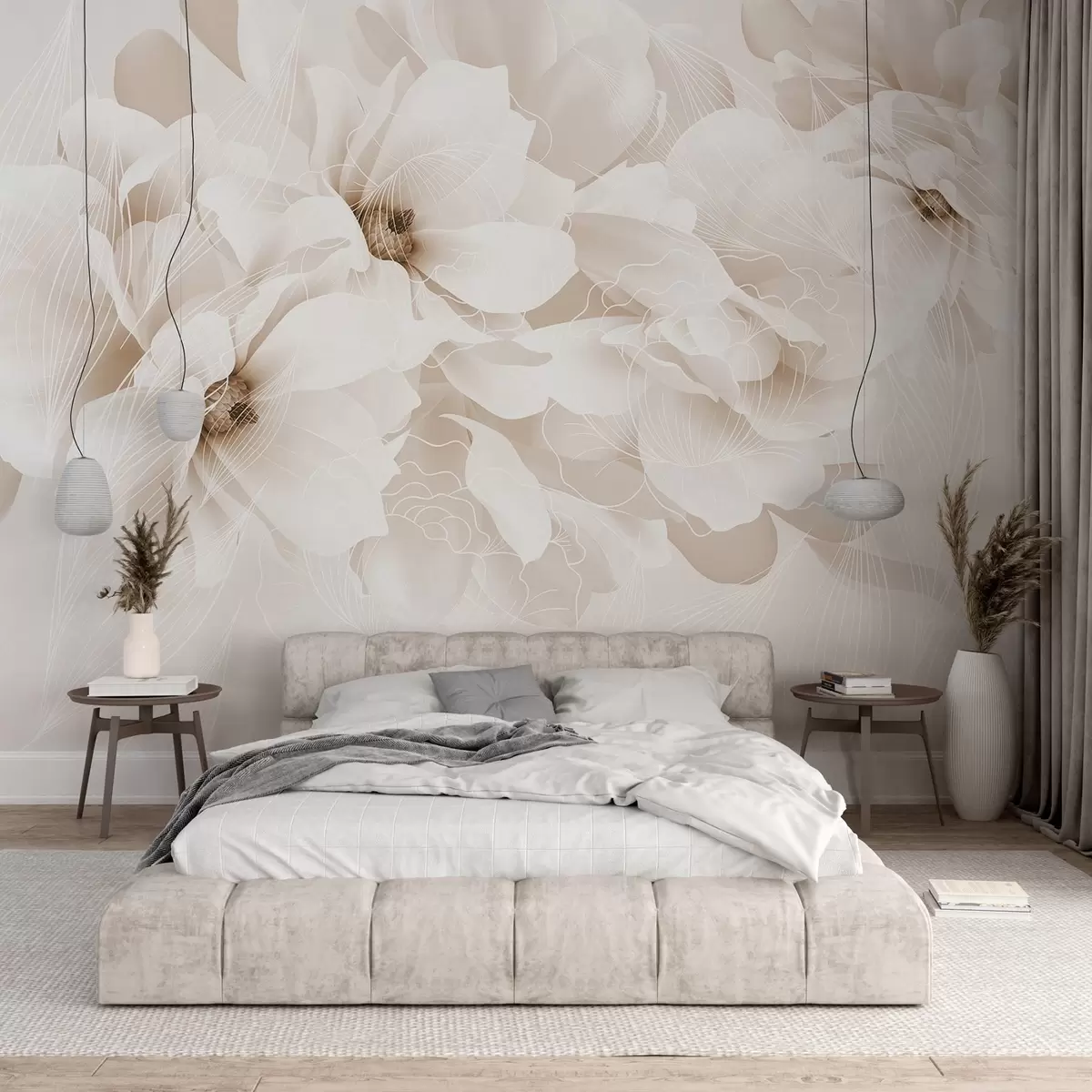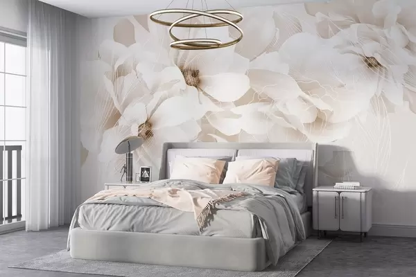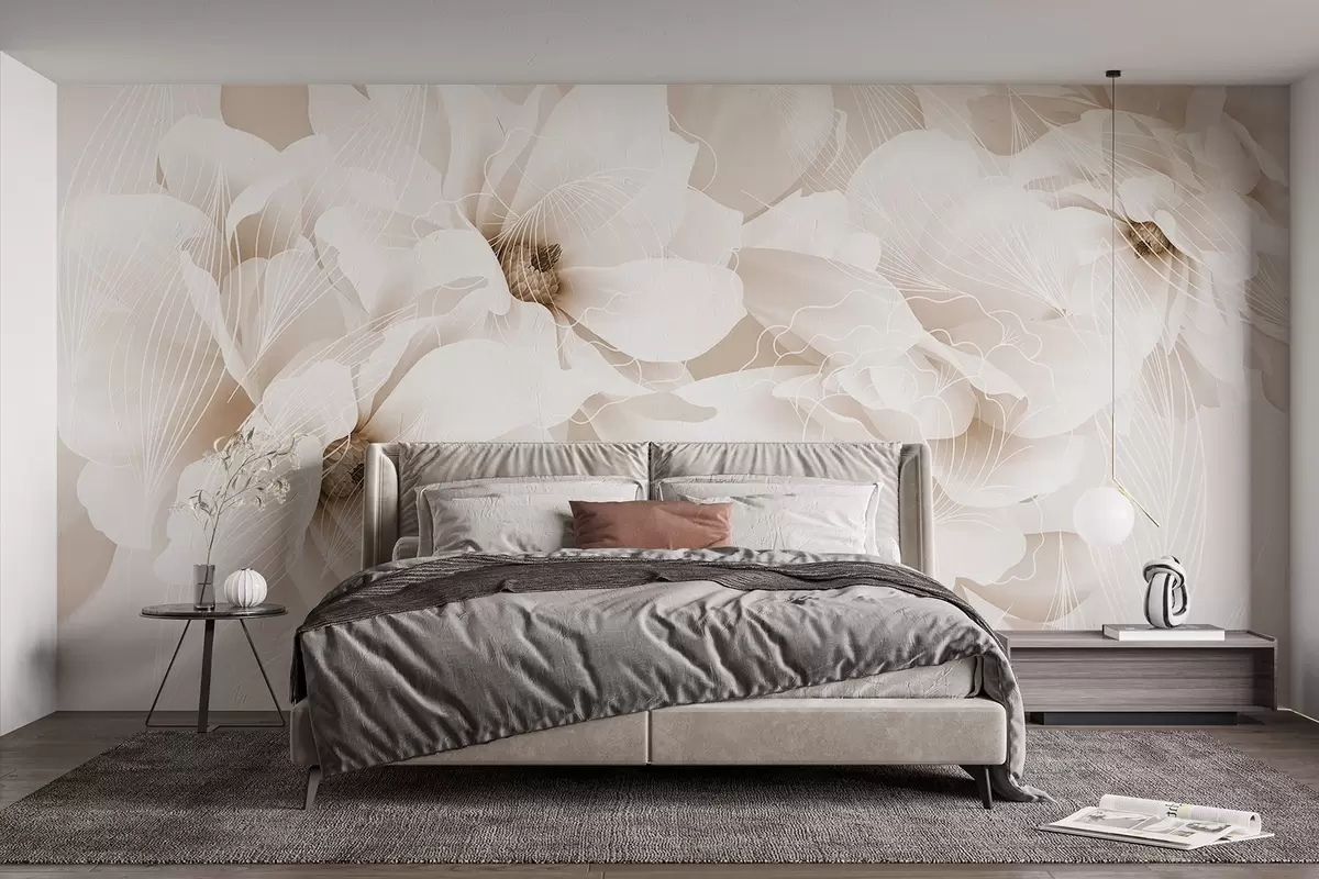 Fototapety Pastelové květy pivoněk s bílými a béžovými jemnými okvětními lístky a bílými linkami na světle béžovém pozadí Č. w08826v1