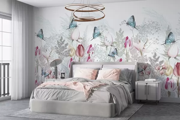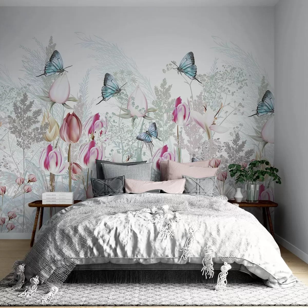 Fototapety Pastelový potisk s květy tulipánů, trávou a motýly poletujícími v zahradě Č. w08834