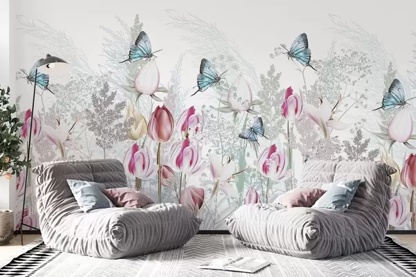 Fototapety Pastelový potisk s květy tulipánů, trávou a motýly poletujícími v zahradě Č. w08834