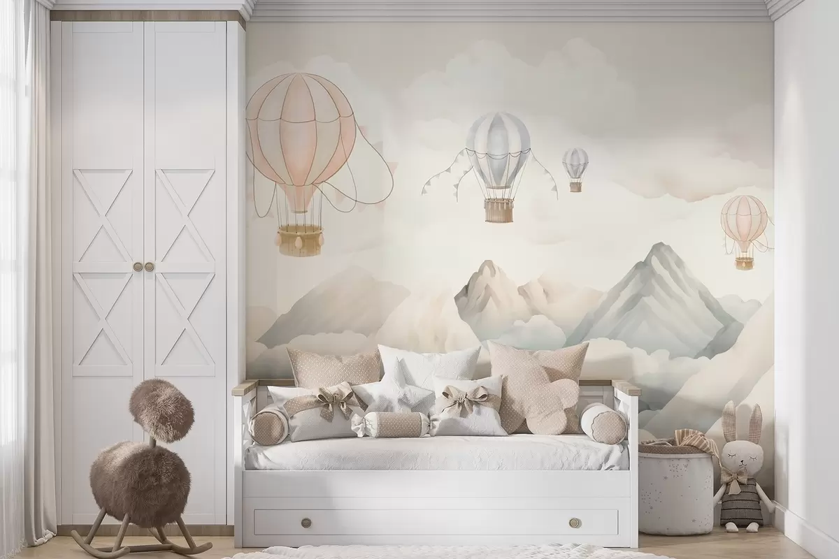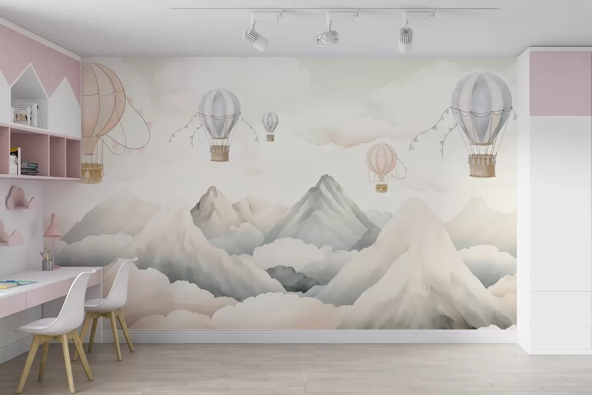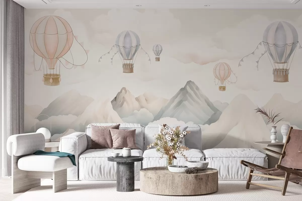 Fototapety Horkovzdušné balóny vznášející se nad horami v neutrálních, jemných pastelových tónech Č. w08853