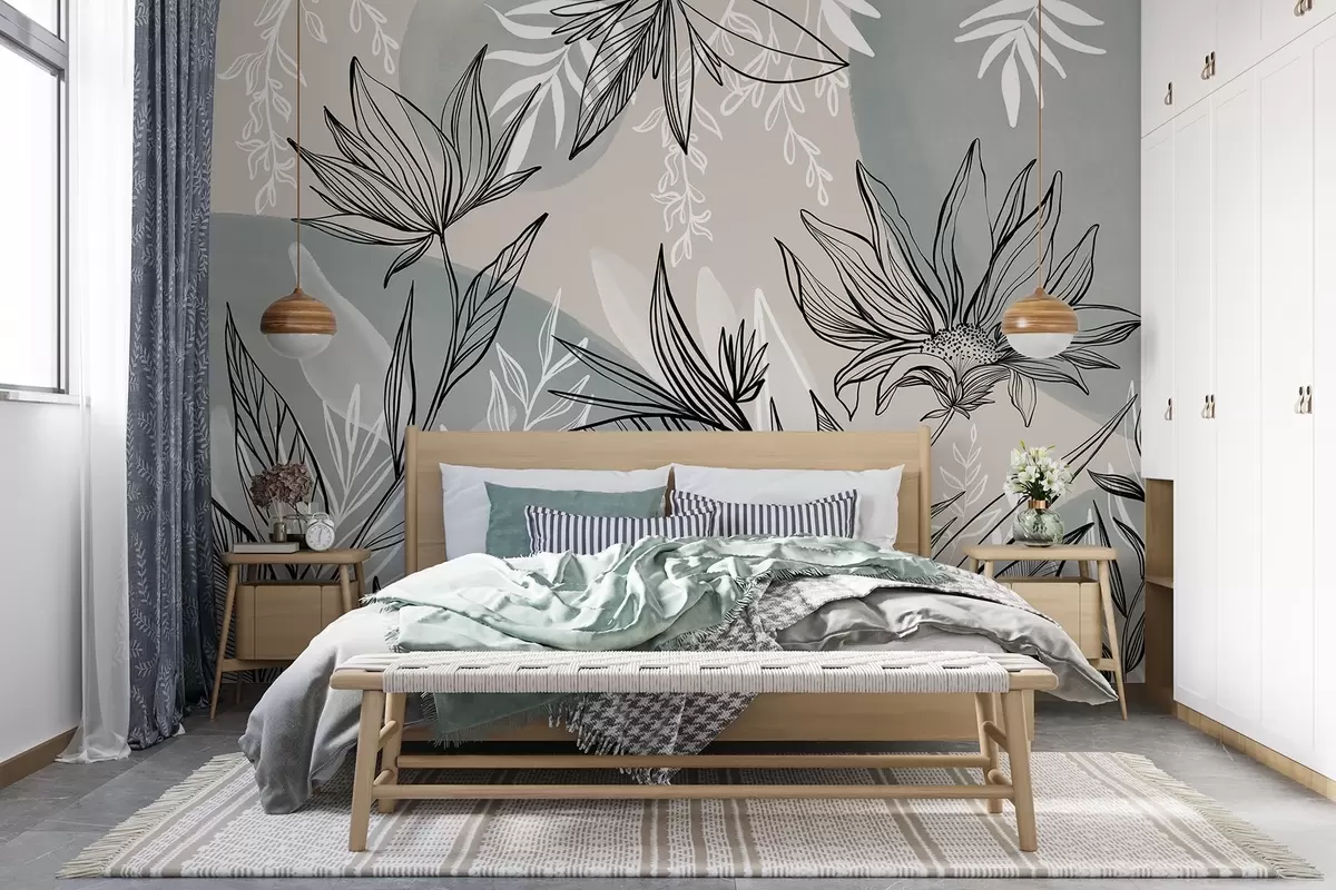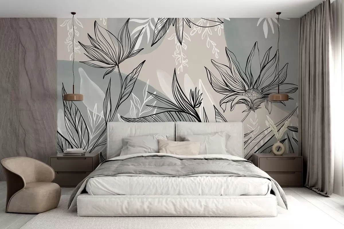 Fototapety Květinové čáry s velkými listy a květy na pozadí béžové a modré akvarelové barvy Č. w08865