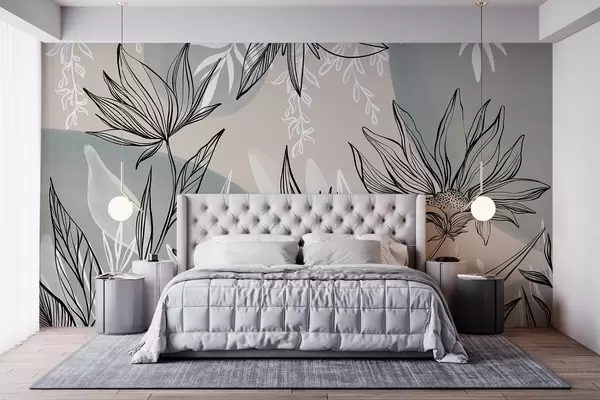 Fototapety Květinové čáry s velkými listy a květy na pozadí béžové a modré akvarelové barvy Č. w08865