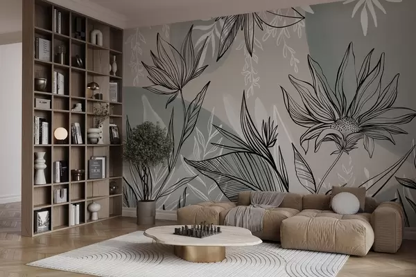 Fototapety Květinové čáry s velkými listy a květy na pozadí béžové a modré akvarelové barvy Č. w08865