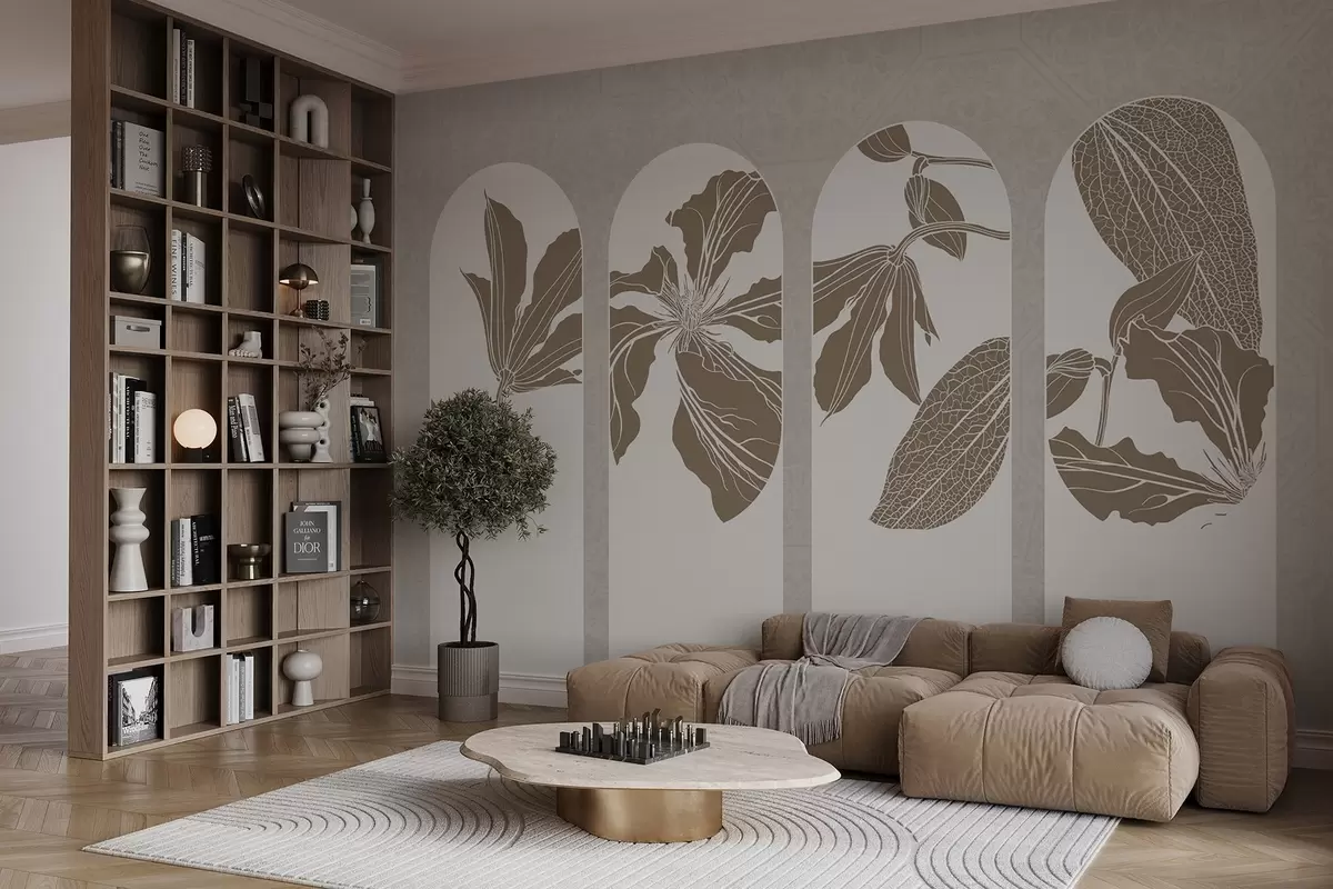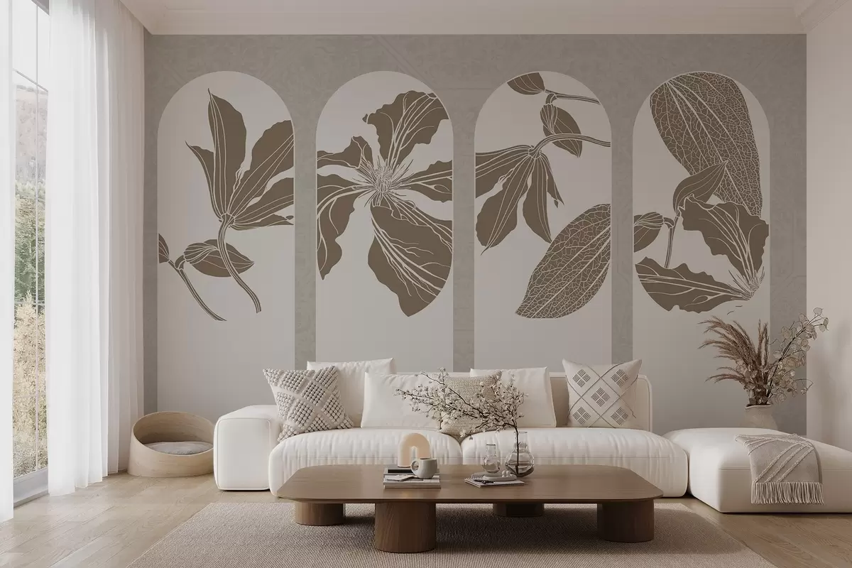 Fototapety Elegantní oblouky s květinovými vzory v béžové a bílé barvě na béžovém pozadí s texturou, minimalistický styl Č. w08866