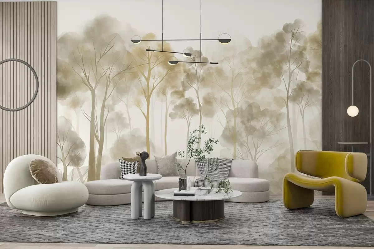 Fototapety Akvarelový les s vysokými světlými stromy v béžových a žlutých odstínech a mlhavou atmosférou Č. w08870