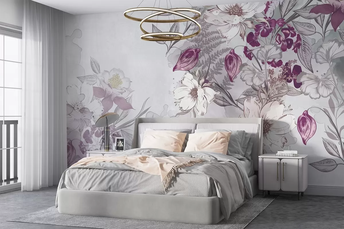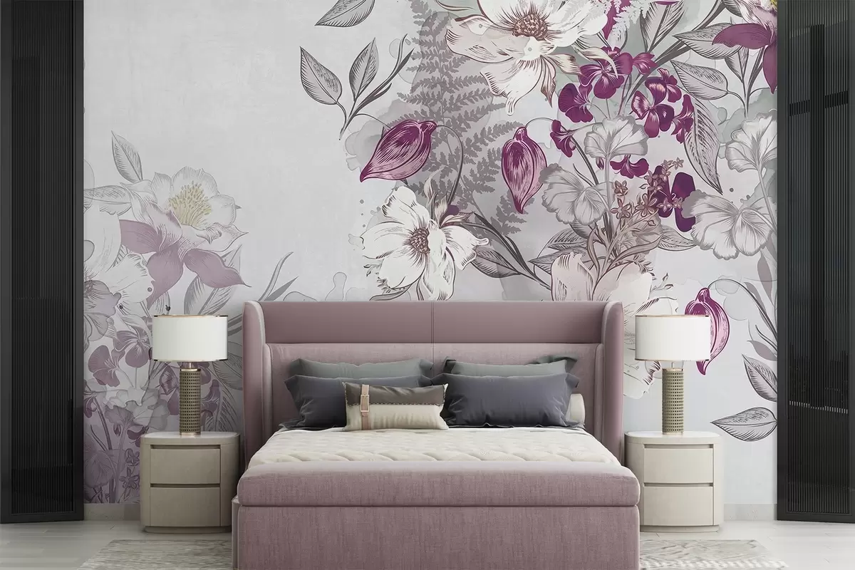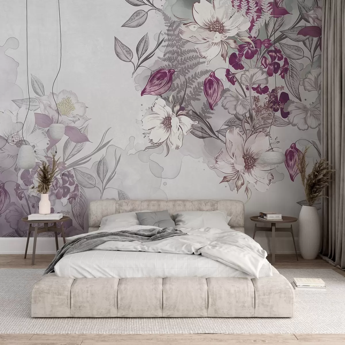 Fototapet Květy s bílými a fialovými okvětními lístky, listy a stonky , akvarelový efekt , světle šedé texturované pozadí  w08899