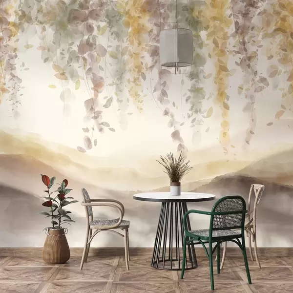 Fototapety Listy vistárie visící nad modrými horami, jemné pastelové žluté a hnědé barvy, krajina ve stylu akvarelu Č. w08909v1