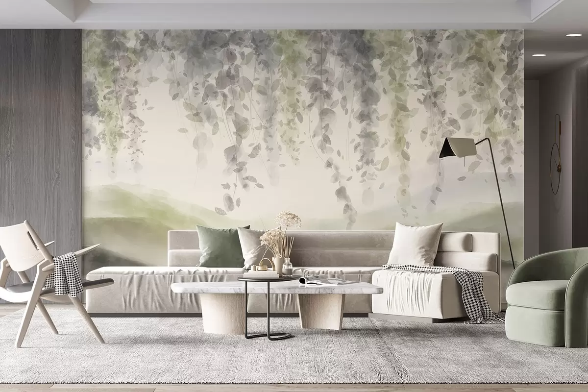 Fototapety Listy vistárie visící nad modrými horami, jemné pastelové zelené a béžové barvy, krajina ve stylu akvarelu Č. w08909v2