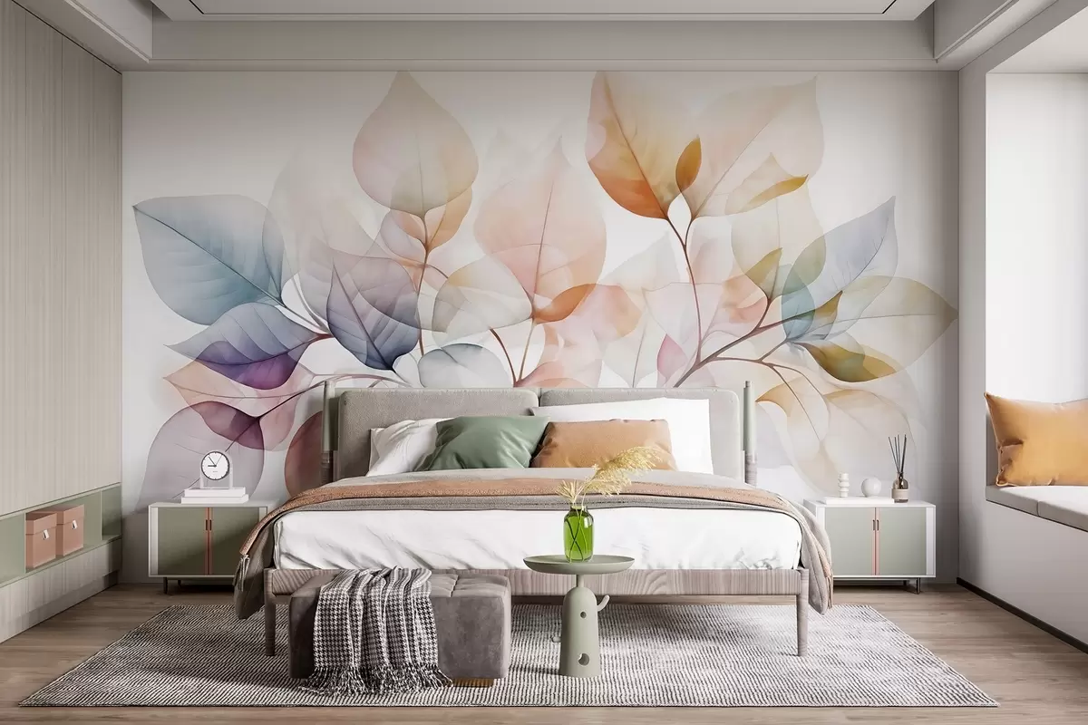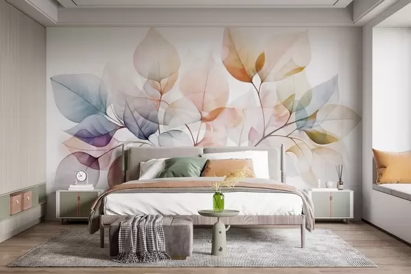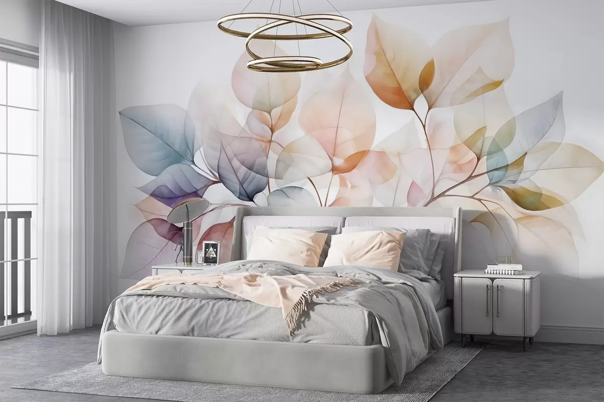 Fototapety Akvarelová malba průsvitných listů v pastelových barvách s odstíny růžové, bílé, fialové a modré Č. w08910