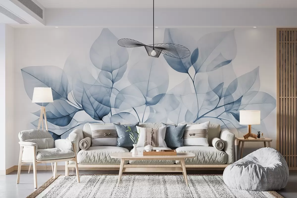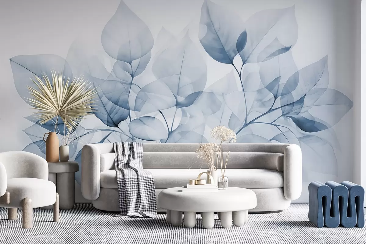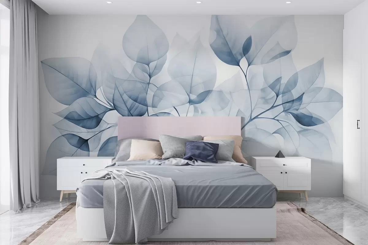 Fototapety Akvarelová malba průsvitných listů v pastelových barvách s odstíny bílé a modré Č. w08910v1