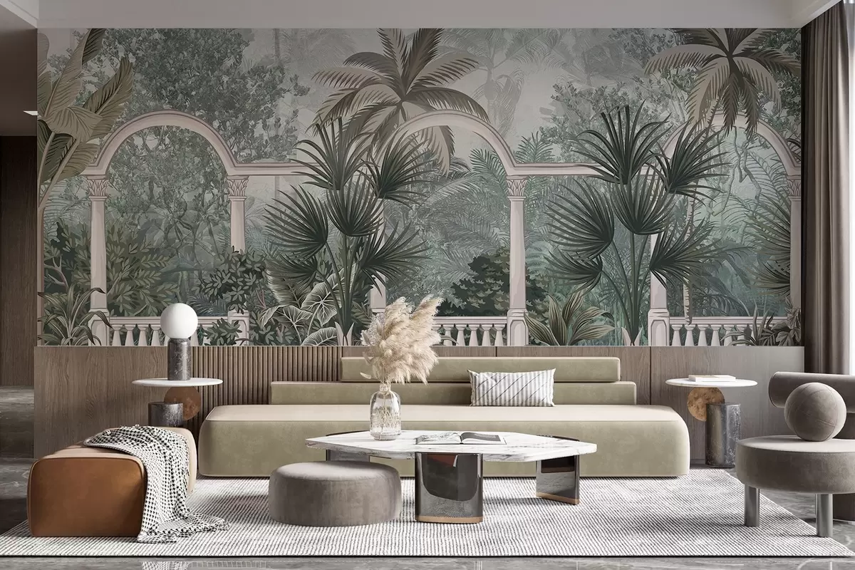 Fototapety Tropická zahrada s palmami a bujnou vegetací, zábradlí s oblouky, tlumené barvy, vintage styl Č. w08916