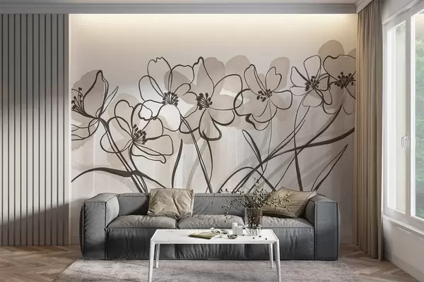 Fototapety Minimalistické line-art květiny s béžovými a hnědými okvětními lístky, dlouhé stonky, světle béžové pozadí Č. w08918