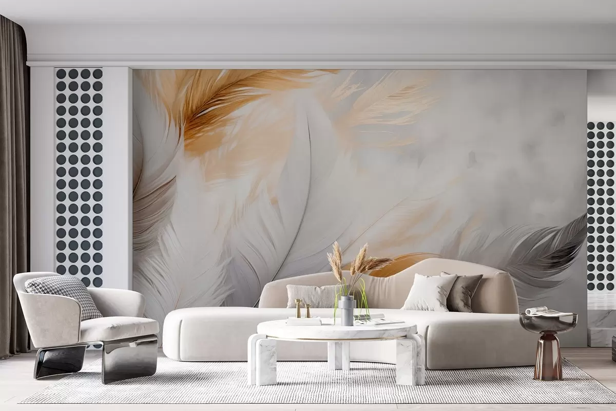 Fototapety Šedé a žluté peří na šedém pozadí Č. w08937