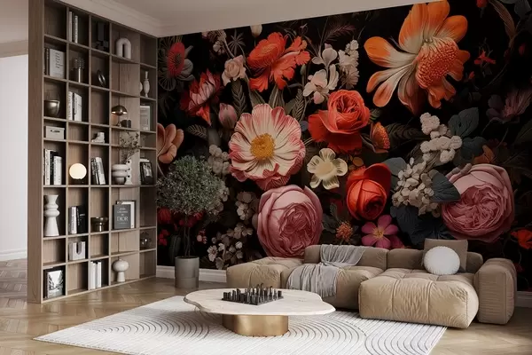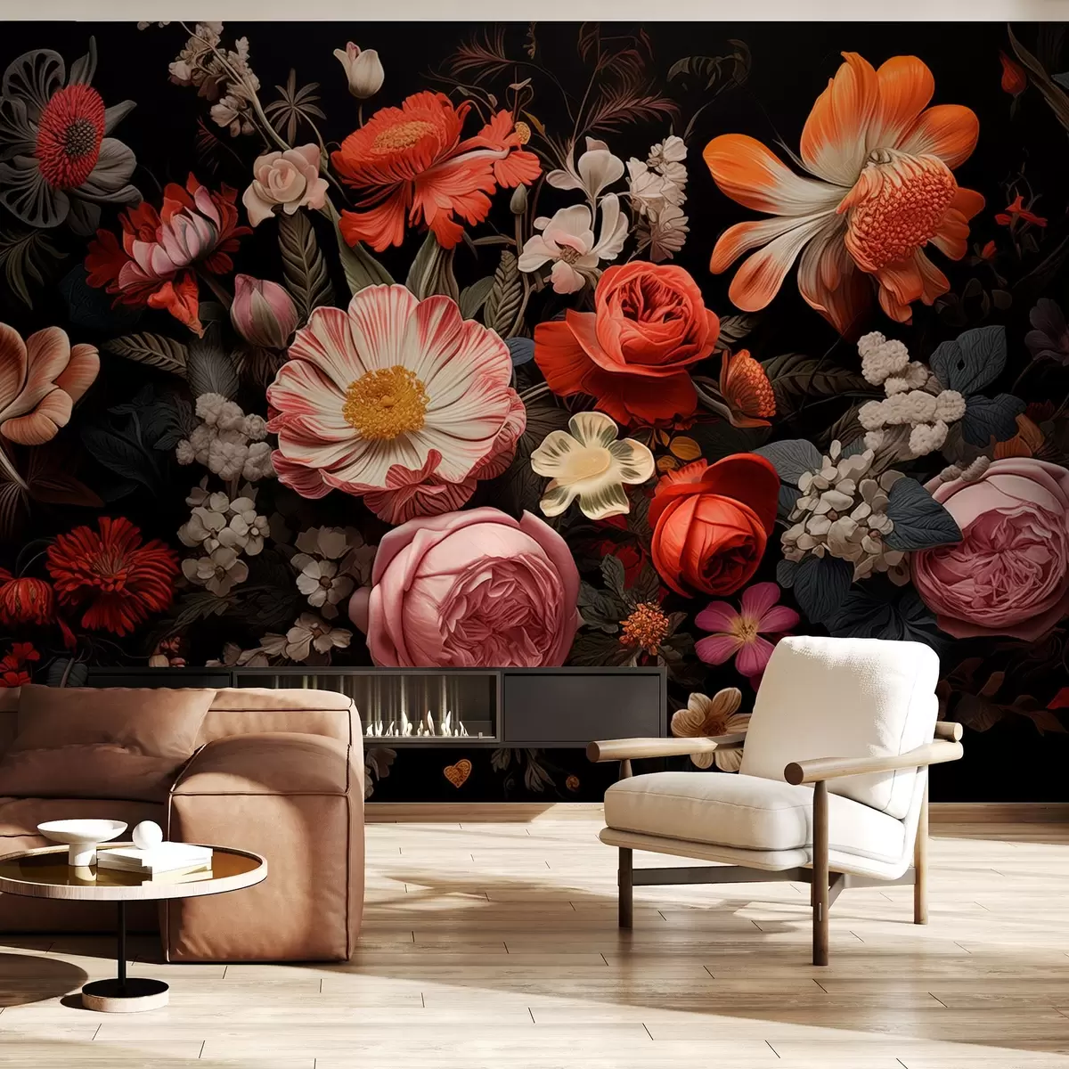 Fototapety Barevná kytice různých květin na tmavém pozadí v teplých tónech Č. w08969