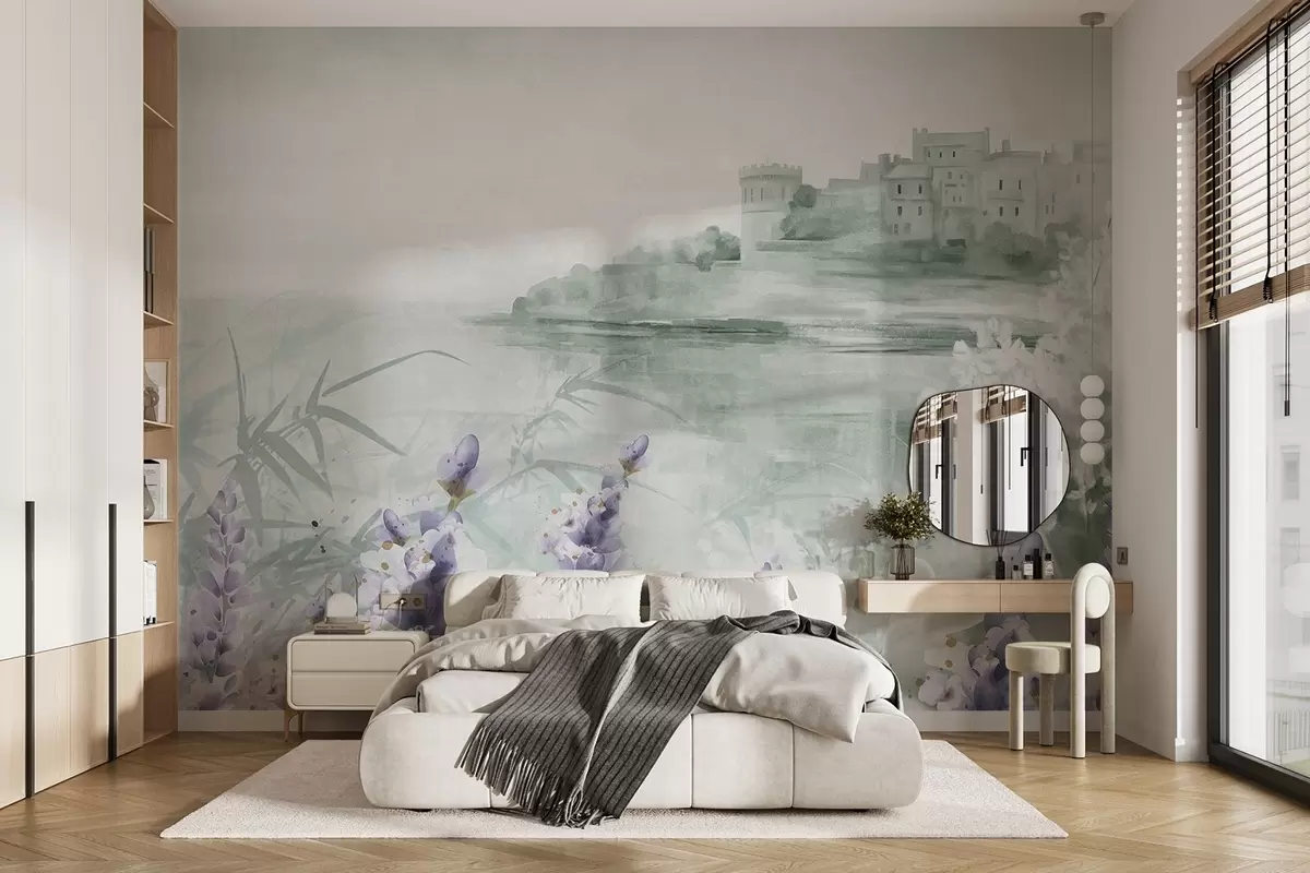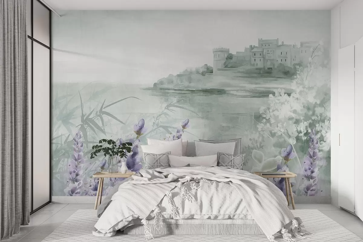 Fototapety Texturovaná vintage krajina s hradem na útesu s výhledem na moře, s levandulovými květy v tlumených barvách Č. w08975
