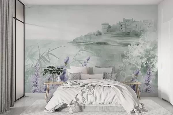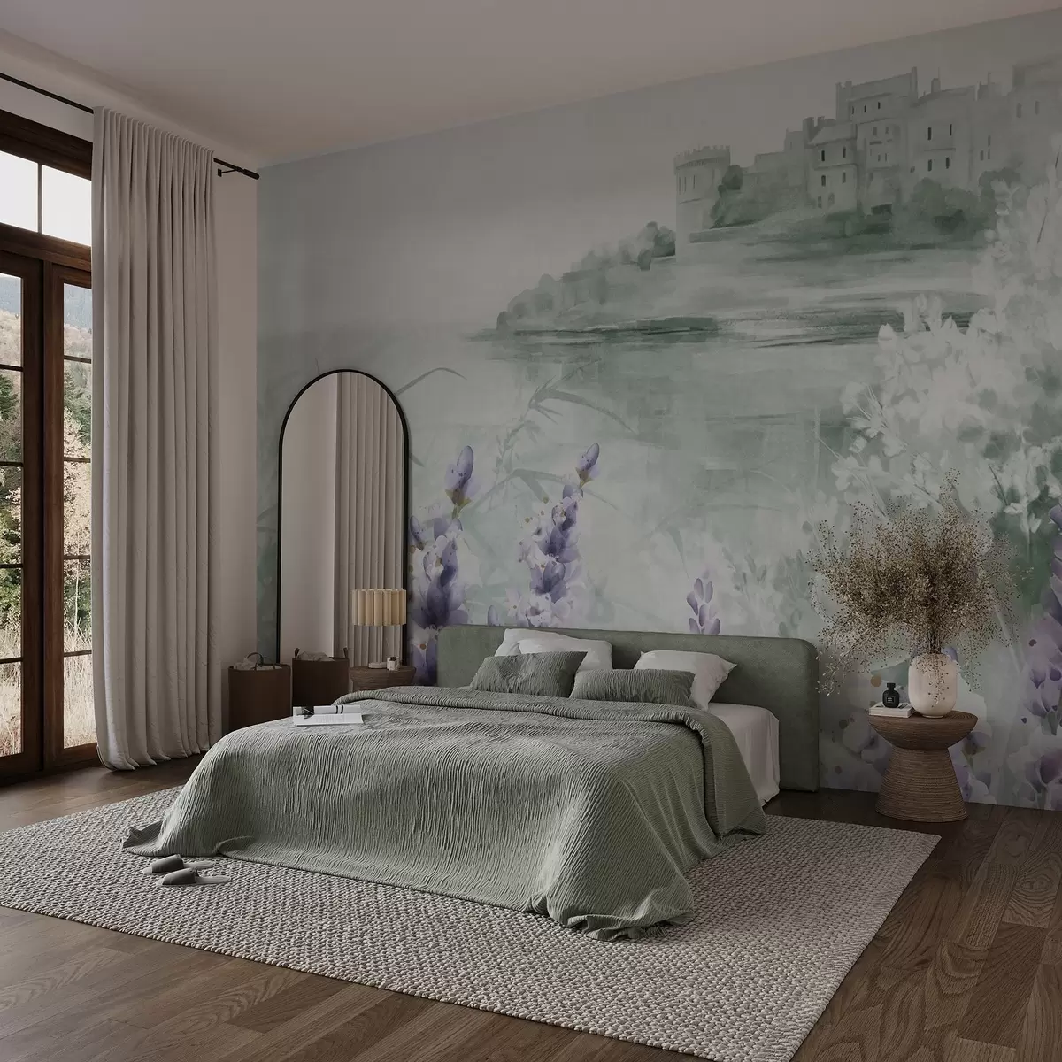 Fototapety Texturovaná vintage krajina s hradem na útesu s výhledem na moře, s levandulovými květy v tlumených barvách Č. w08975