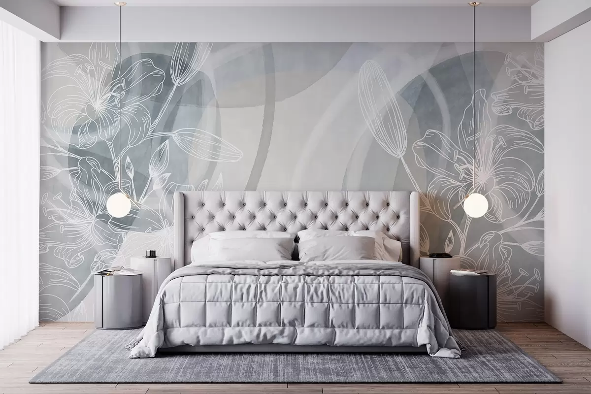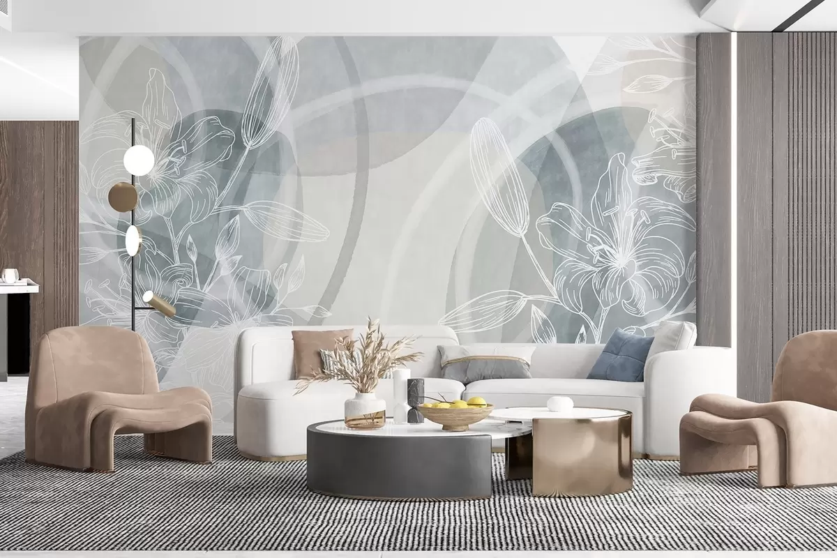 Fototapety Minimalistický květinový design s bílými květy a listy, překrývajícími se abstraktními kruhy v odstínech šedé a modré Č. w08979