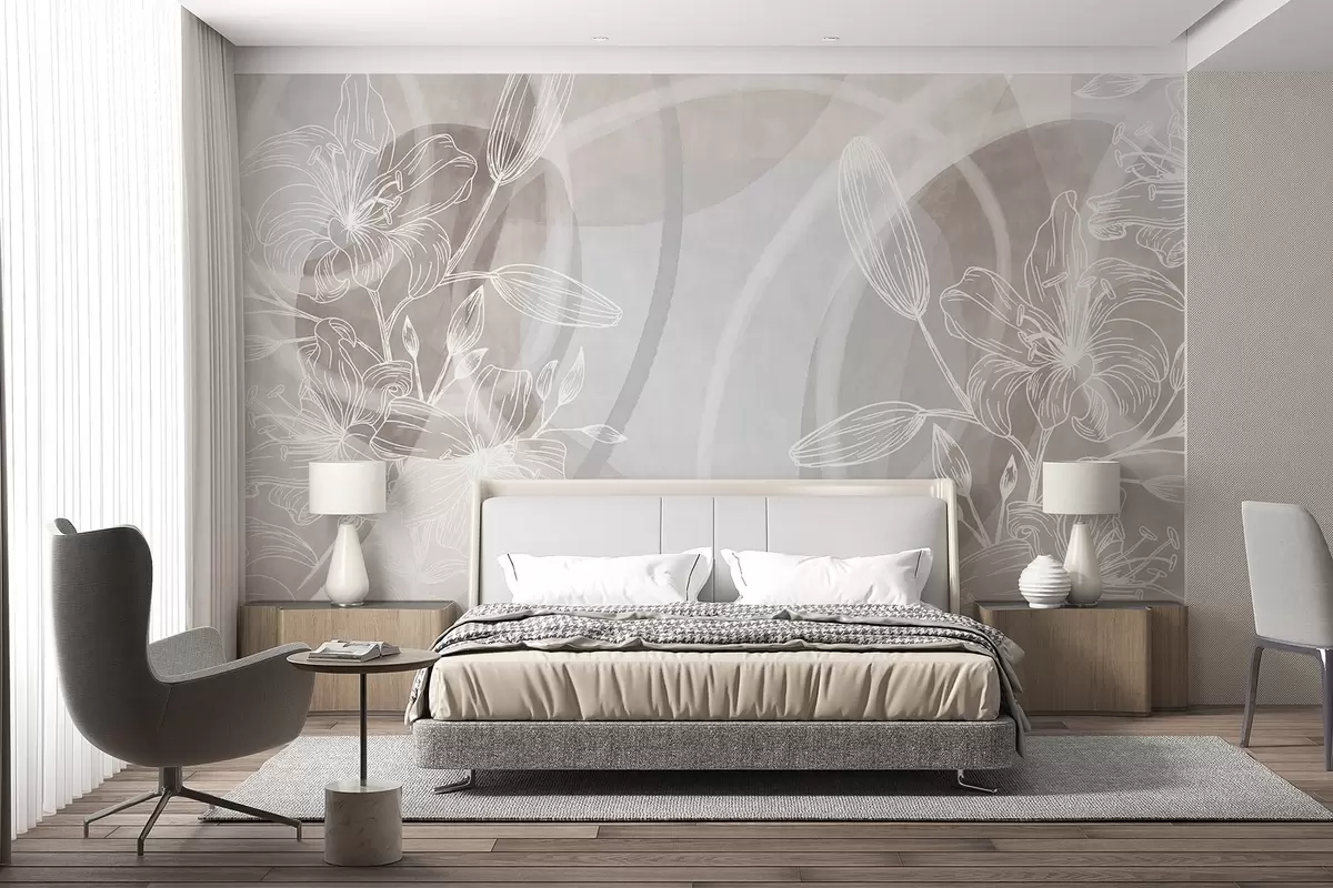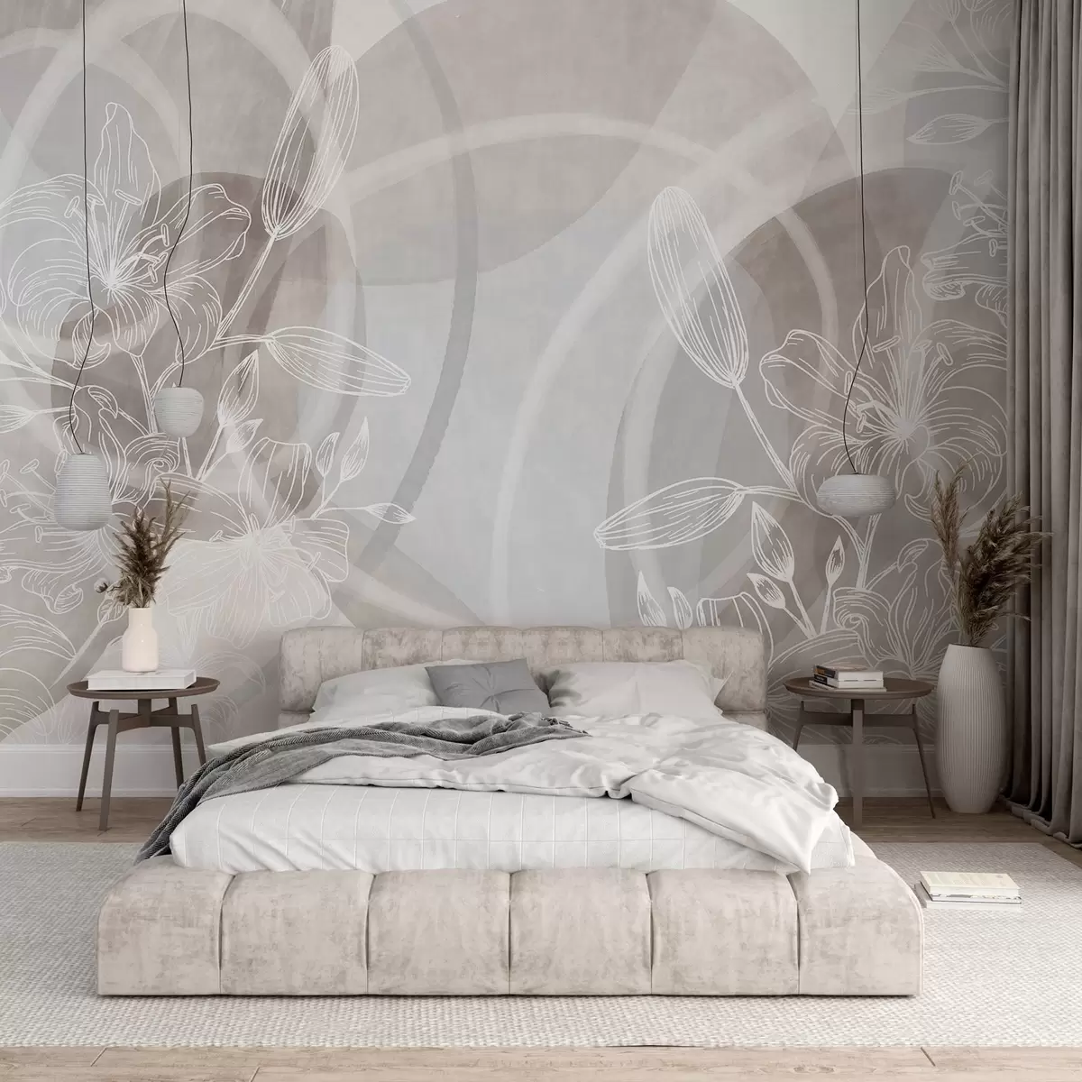 Fototapety Minimalistický květinový design s bílými květy a listy, překrývajícími se abstraktními kruhy v béžových a modrých odstínech Č. w08979v1