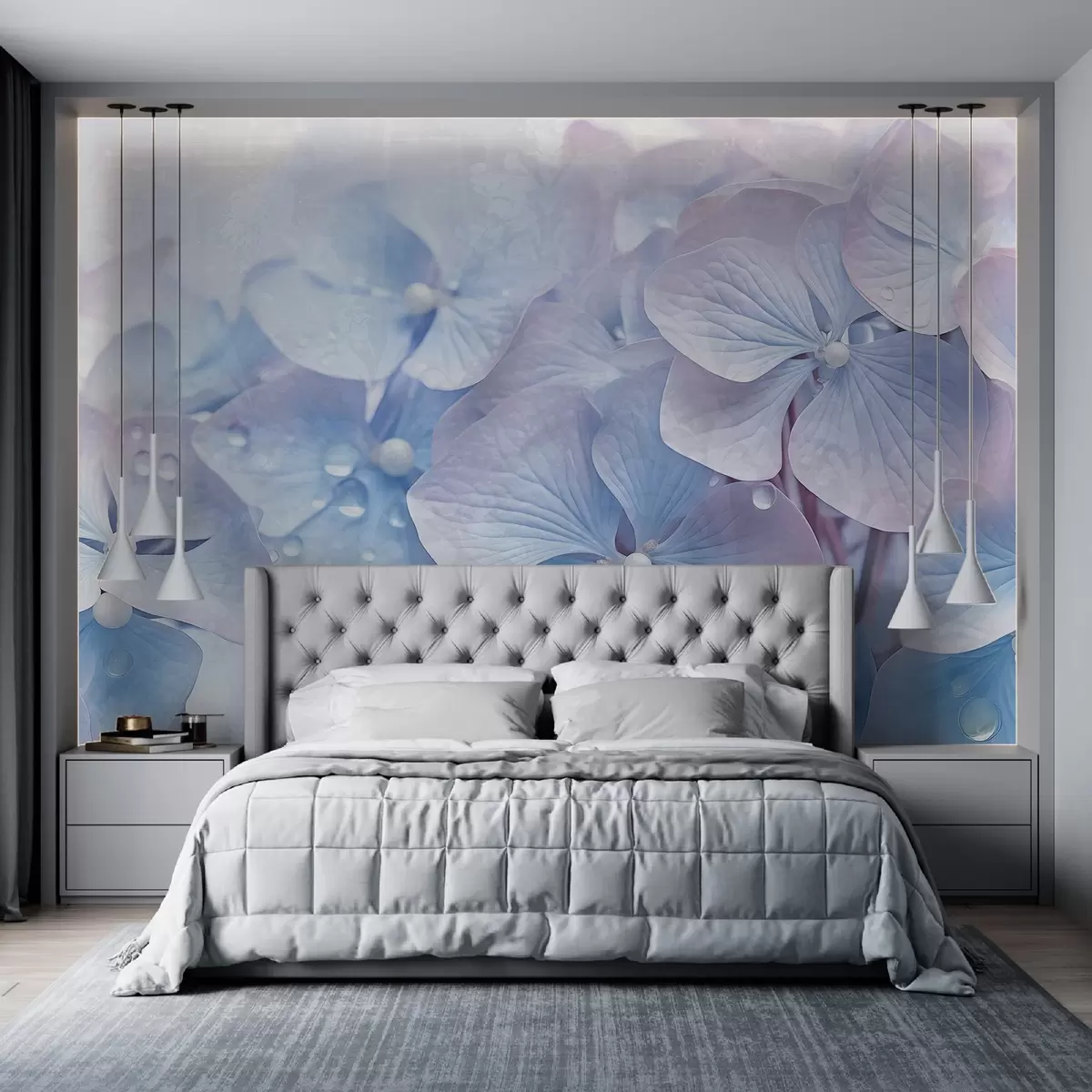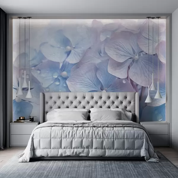 Fototapety Vintage texturované modré a růžové květy hortenzie s kapkami vody na okvětních lístcích, rozmazané růžové pozadí Č. w08981