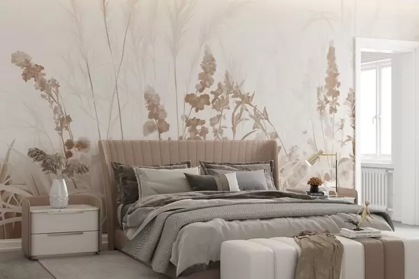 Fototapety Hnědé květy a béžové rákosí v poli, minimalistická malířská textura, světlé pozadí, měkké barvy, jemné tahy štětcem Č. w08982v1