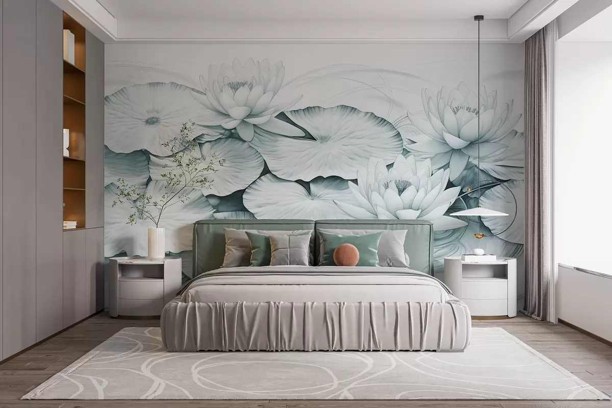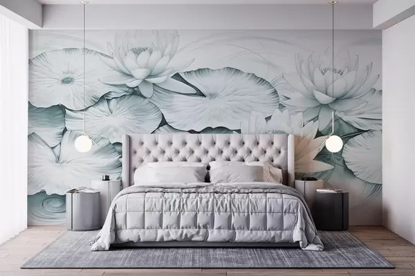 Fototapety Lekníny a lekníny v rybníce, tyrkysová a bílá imitace kresby tužkou, detailní botanická ilustrace, přírodní umění Č. w09006v1