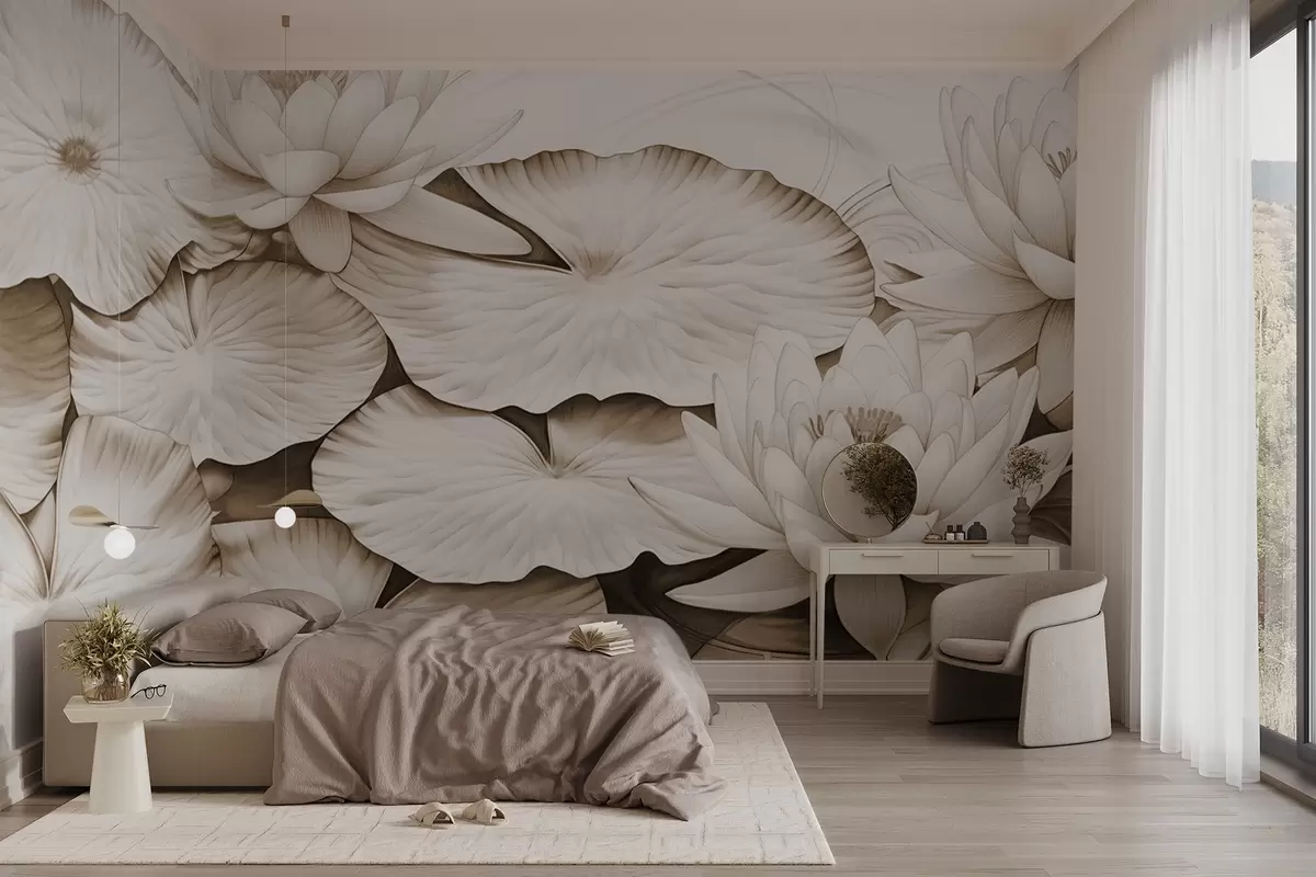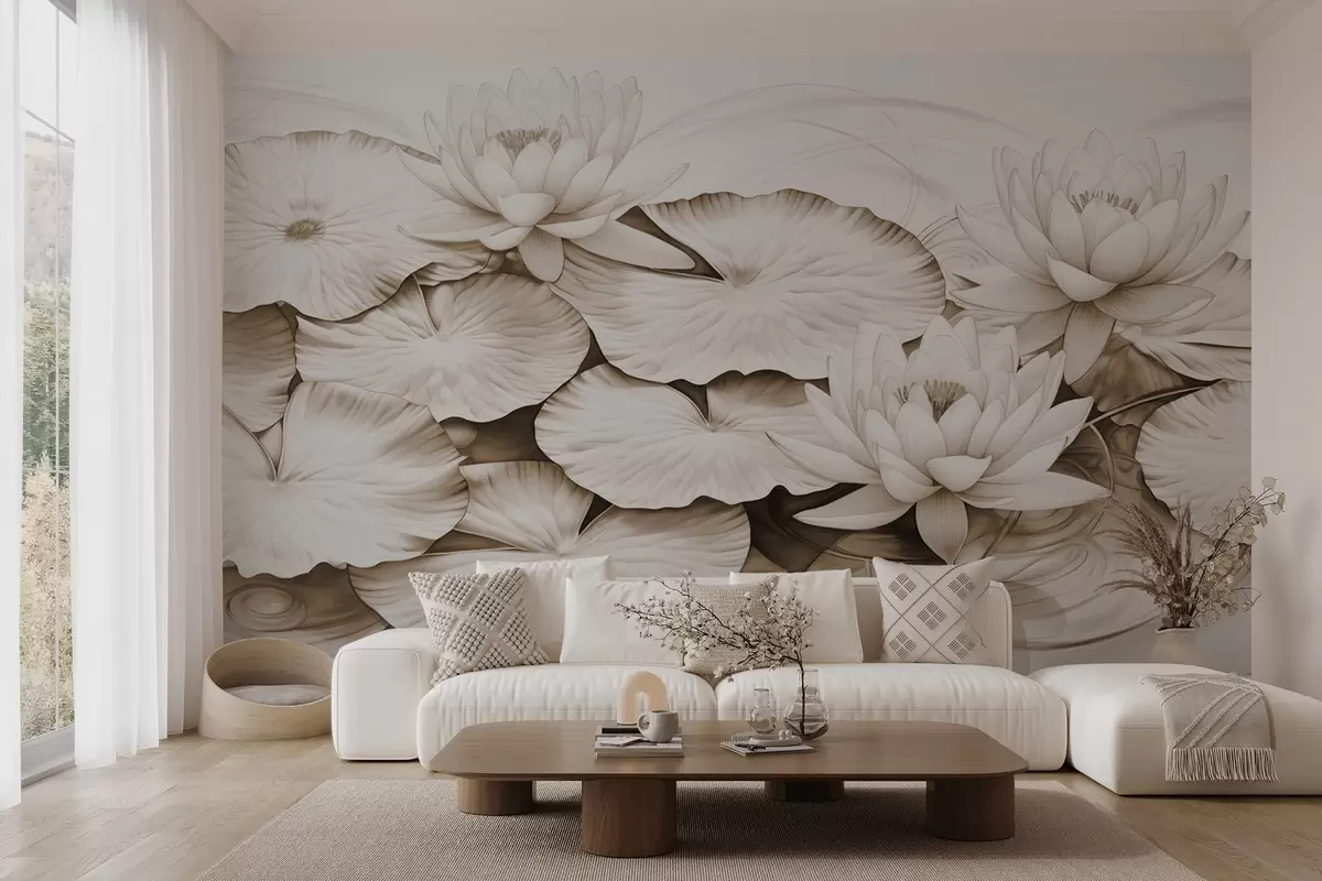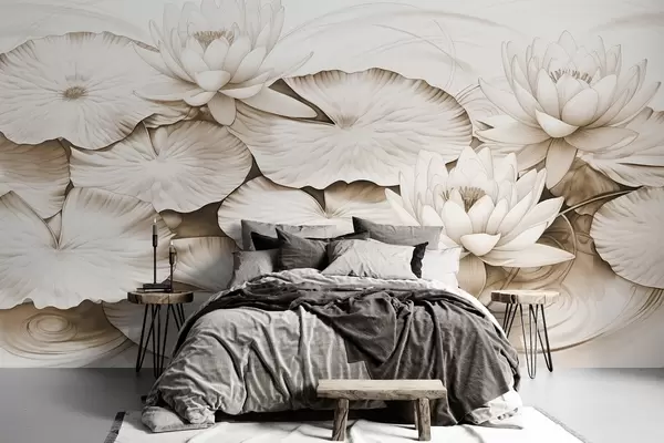 Fototapety Lekníny a lekníny v rybníce, hnědobílá imitace kresby tužkou, detailní botanická ilustrace, přírodní umění Č. w09006v2